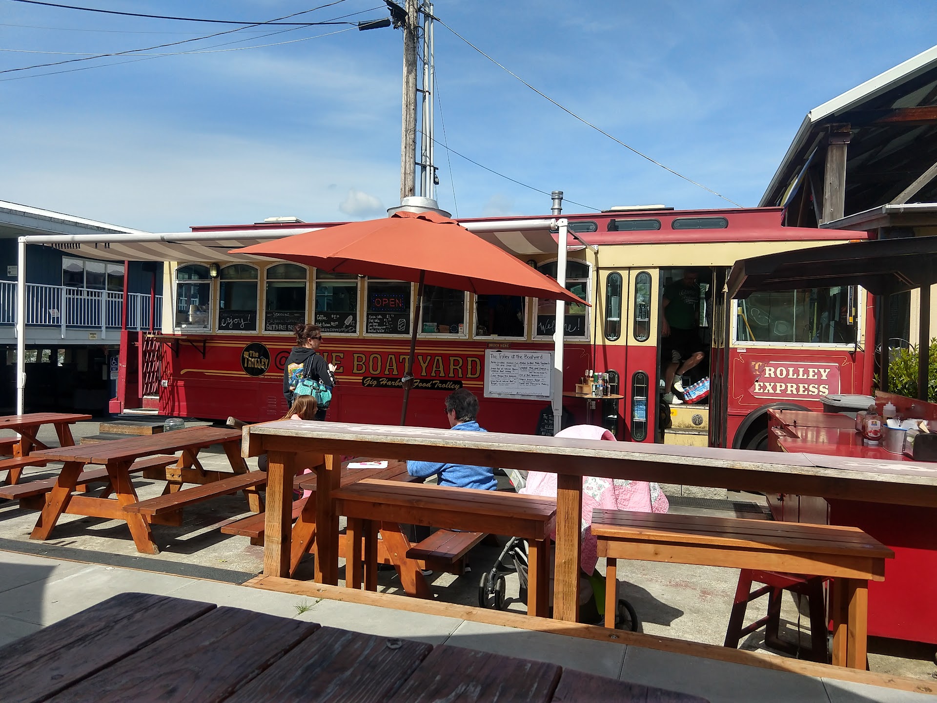 Read moreI love the Trolley at the Boatyard! You can choose to sit at one of their many picnic benches and eat but I like to order my food and go next door to Evergreen State Brewing and enjoy a nice cold beer while I wait for my order. The owner, Carlen, gives me a call when it's ready to be picked up. My favorites are the burger and fries (the fries stay crispy until they're gone), and the chicken fettuccine is the best I've ever had! The sauce is creamy, and I love the veggies mixed in with it! Genuinely friendly, enthusiastic service and delicious food in gorgeous downtown Gig Harbor! Don't just take my word for it give The Trolley a try...