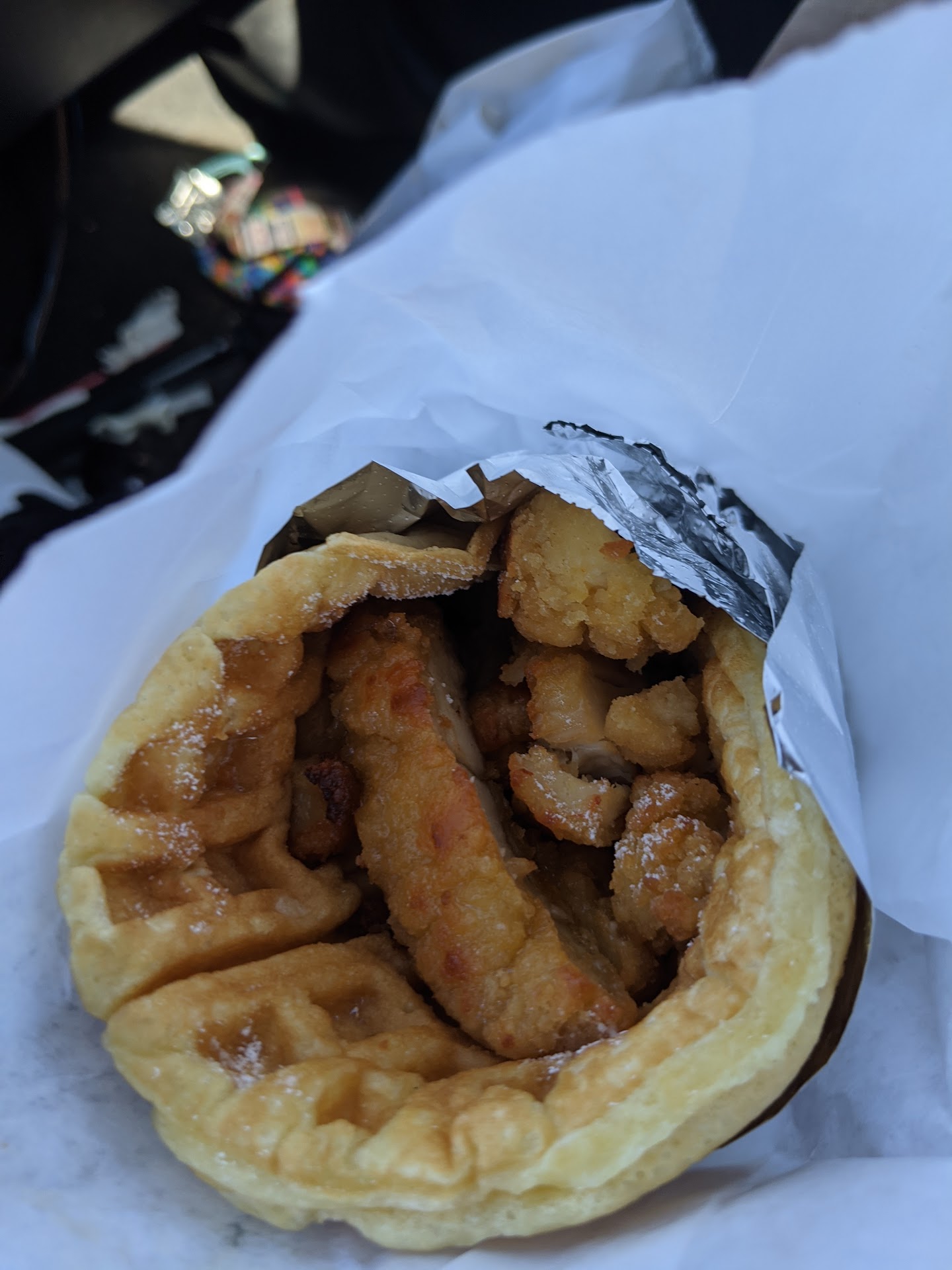 What I didn't realize, there would be no discount. My mom got the chicken and waffle (but on a bagel). They must like Costco, because the chicken was sliced nuggets from Costco. It was almost 20 bucks. I had a croissant with butter: about 12 bucks.