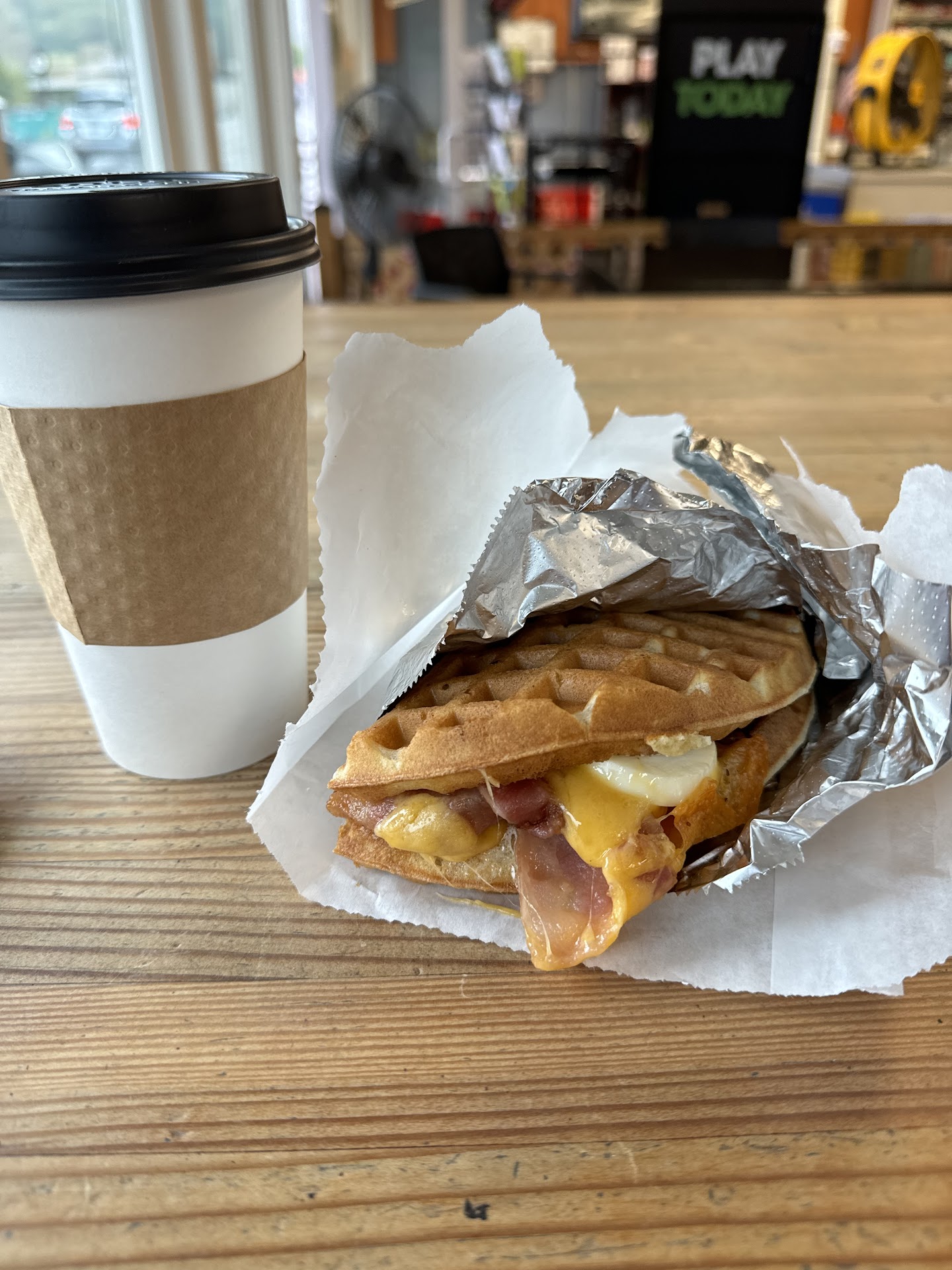 We get there and there are no waffles. We could substitute a Costco croissant or Costco bagel. We didn't really want to deal with the traffic, so we have it a shot.
