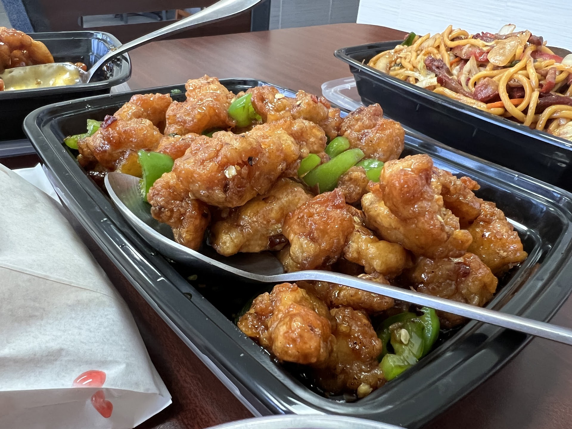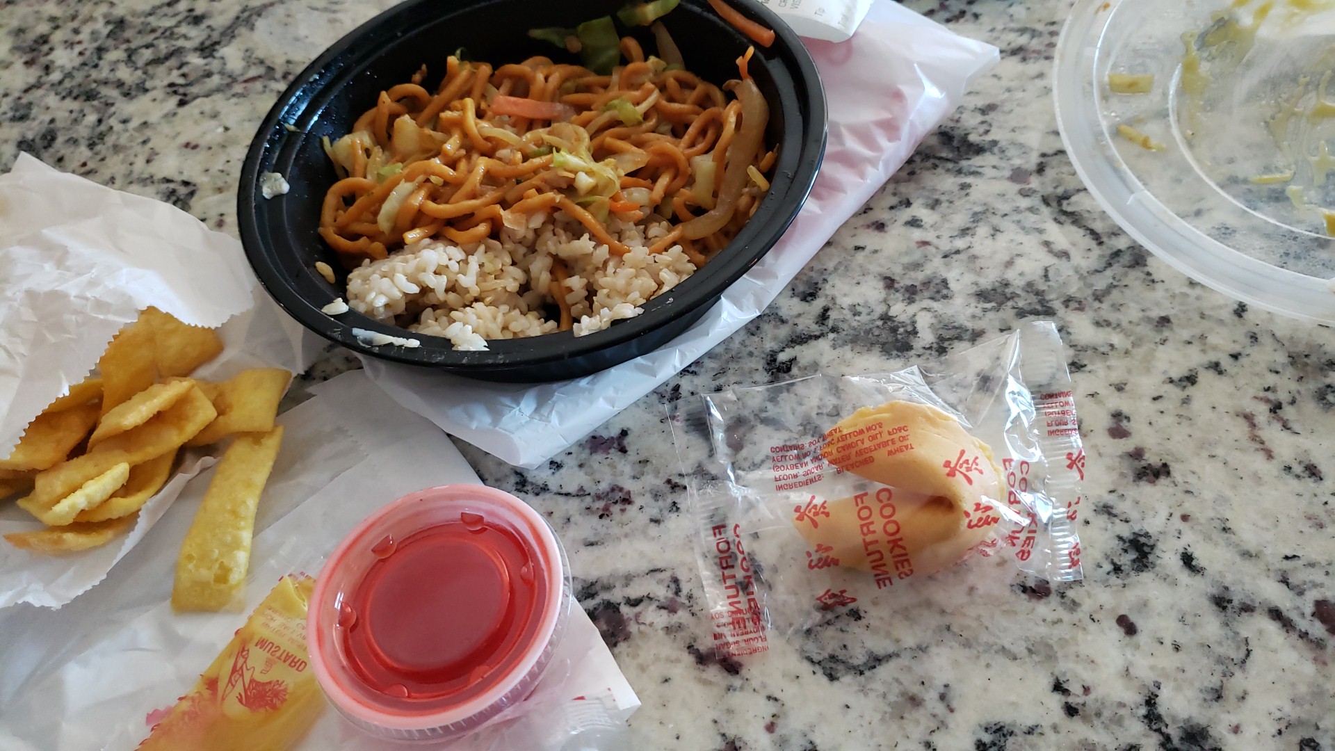 And then you get 3 entrees. We got the general tsos chicken and orange chicken (both good) they had a little spice but not too much heat. I'm sensitive to it and it wasn't too much for me but it does have some spiciness. And they tell you that on the menu, and it's accurate. And then we got the roast pork lo mein and it was very good. I'm not a huge lo mein fan but I would get that again. While we were there people kept coming in for take-out, so people like it. I'll go back.
