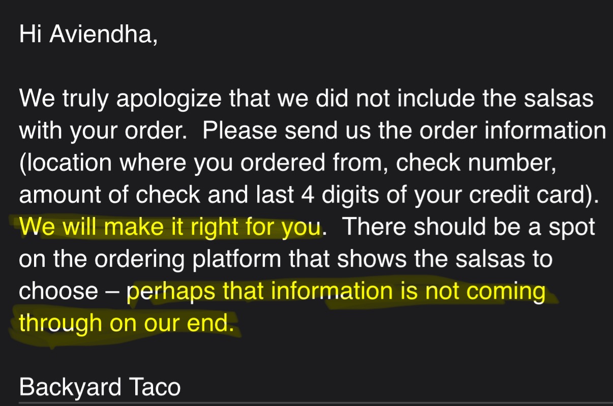 Ā Ā Ā Read moreI went through the drive thru today to place my order for a 2 taco plate with chicken and another 2 taco plate with shredded pork. The process to place my order was painful because the order taker was not understanding my order. The first time she repeated my order, I corrected her. She apologized, said she would update the order, and then repeated my order back to me. Shockingly this happened 3 more times. After finally repeating back my order correctly, I drove to the pick up window. I was met by a young woman who had āTielā on her name tag (not sure if she was the one who took my order). I paid for my order and she handed me a bag and asked if I wanted any salsas, which I said yes please. While she was getting those, I noticed that my bag seemed light, so I looked inside and saw that things were missing. When she returned to the window with the salsas, she handed them to me (6 tiny containers worth) without a bag and one ended up falling to the ground. I then asked her if the bag she previously handed to me was my complete order and she said yes. I explained that things were missing. She looked confused and summoned a manager with the name tag āMariaā (who never made eye contact, nor spoke a word to me). After some back and forth Tiel handed me 2 more bags. No apology. When I got home and emptied the contents of all 3 bags, everything was there, however, we received 1 extra item (looked like a bean quesadilla) which I assume belonged to someone else. After working all day, I just wanted to pick up a quick meal and chose Backyard Taco because it was close by. NEVER AGAIN. In-N-Out & Rubios consistently offer excellent customer service and tasty meals served quickly and accurately, so thatās where Iāll be taking...