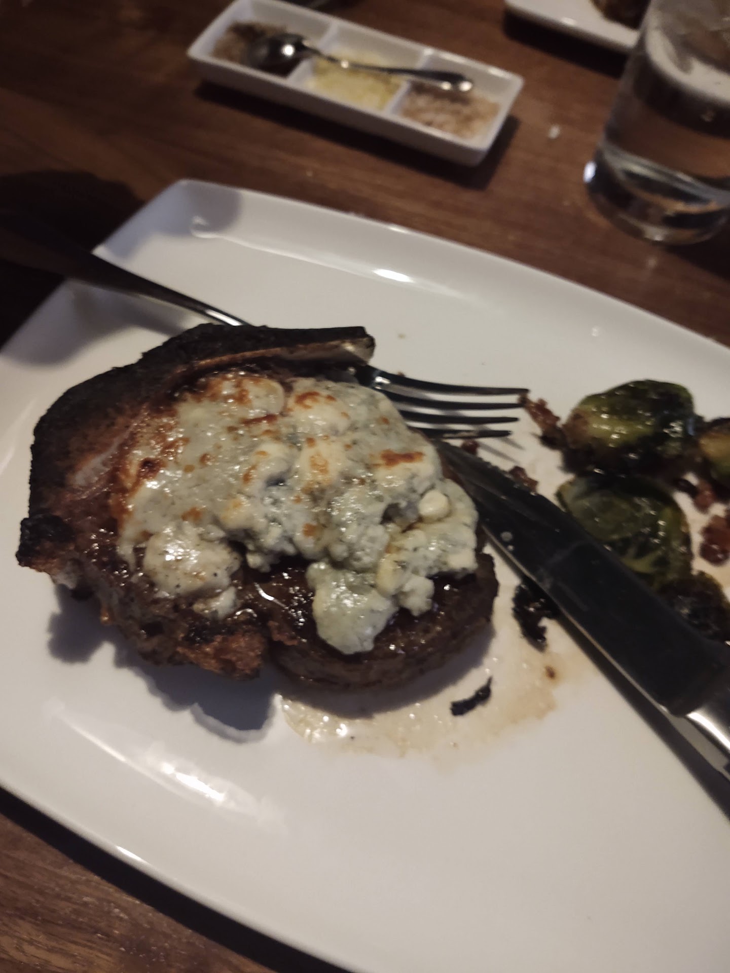 The a la carte shows up with the protein, well timed, but two servers dance around the table providing service of each side, dropping the protein from the Brussel Sprouts on the empty chair, and just plain crowding the table.
