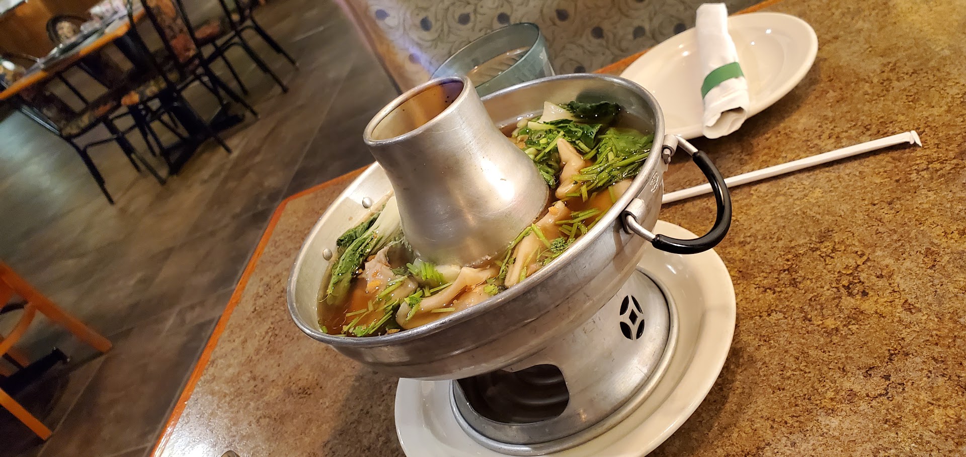I ordered shrimp wonton soup for the appetizer. It came out and was sizzling, literally. The metal bowl with the wonton soup was centered with an oil lamp which kept the soup hot. The lamp burned out in a few minutes, keeping the soup hot while we enjoyed it. It was simple wonton, which wrapped shrimp, and the broth was enhanced with fresh bok choy. At $17 it was unique, but at this price, only reasonable for purchase in a meal on special occasions.