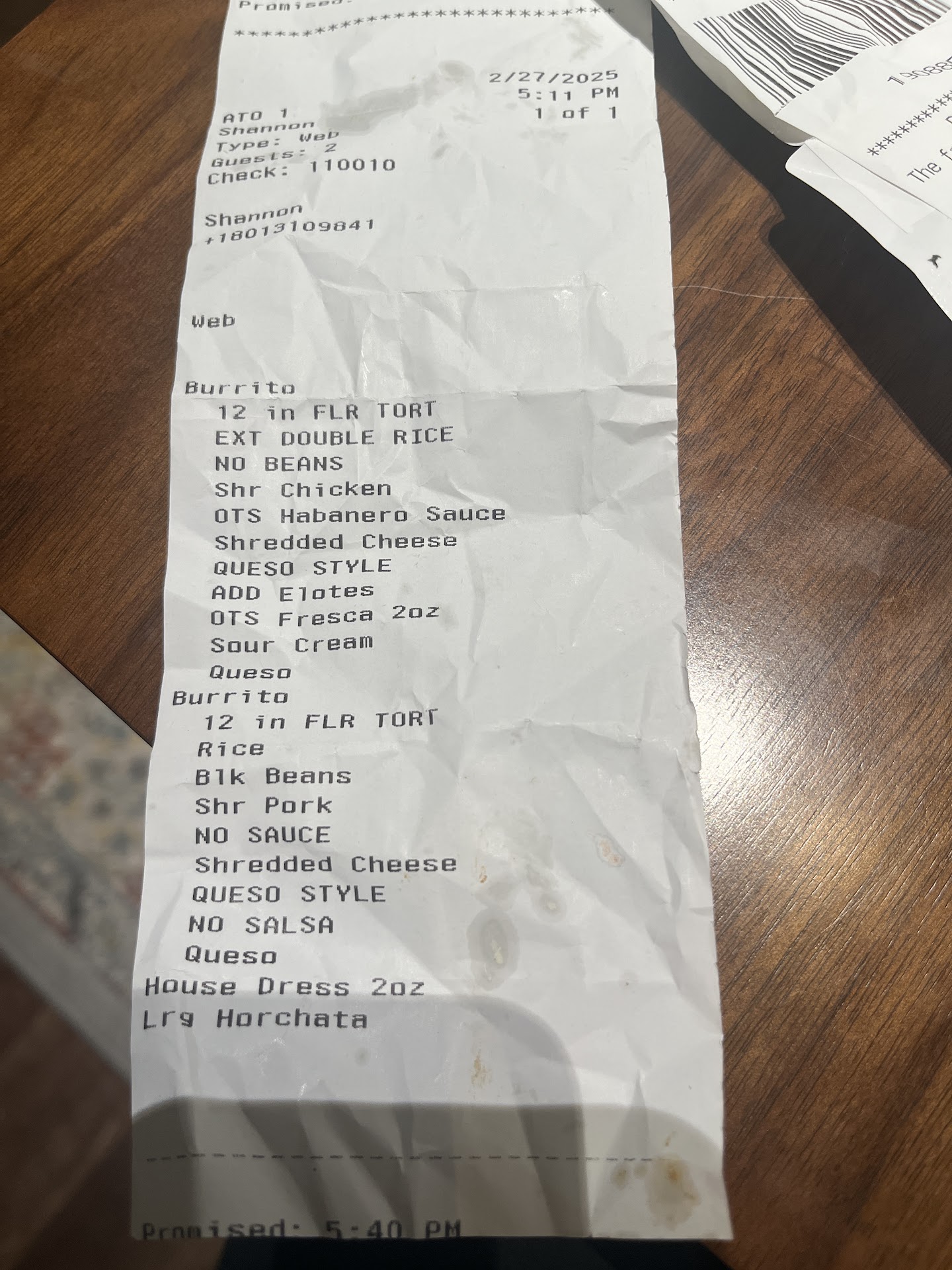 Read moreThis order was placed on February 27th, 2025. I ordered two burritos from the website for in-store pickup. Both burritos were ordered to have queso on the inside and outside of them (which is an up charge of $1.79X2 for it to be topped with queso and $2.29X2 for queso style totaling $8.16 before taxes extra I am paying). With that said, once I got home I discovered that only one of the burritos was topped with queso, luckily I lived close to the location so I drove back to show them my receipt and to get my queso for the burrito. They apologized and topped the burrito with queso. Once I got home and my husband and I started eating, we discovered that BOTH of our burritos did not have any queso on the inside of our burritos. So, with all the queso that we had purchased we originally received on 1/4 of what we payed for (1/2 after I drove back to the store). In addition, the rice in both burritos were undercooked to the point where we did not finish our food. I also ordered Habanero sauce on the side and was given Hatch Chile sauce and I did not have any shredded cheese in my burrito, which was easy to see since there wasn't any queso to cover it up, and the horchata was not great at all. We also were not given any utensils. The store had only one other family in line ordering and the lobby was virtually empty. There is no reason why there would have been so many mistakes to my order. The fact we paid about $17-$19 per burrito should mean we don't need to check the outside AND inside of our order before leaving the store. This trip resulted in wasted money and food. The photos show my order, showing we ordered queso 2 times per burrito, no queso INSIDE the burrito and the habanero sauce I did...