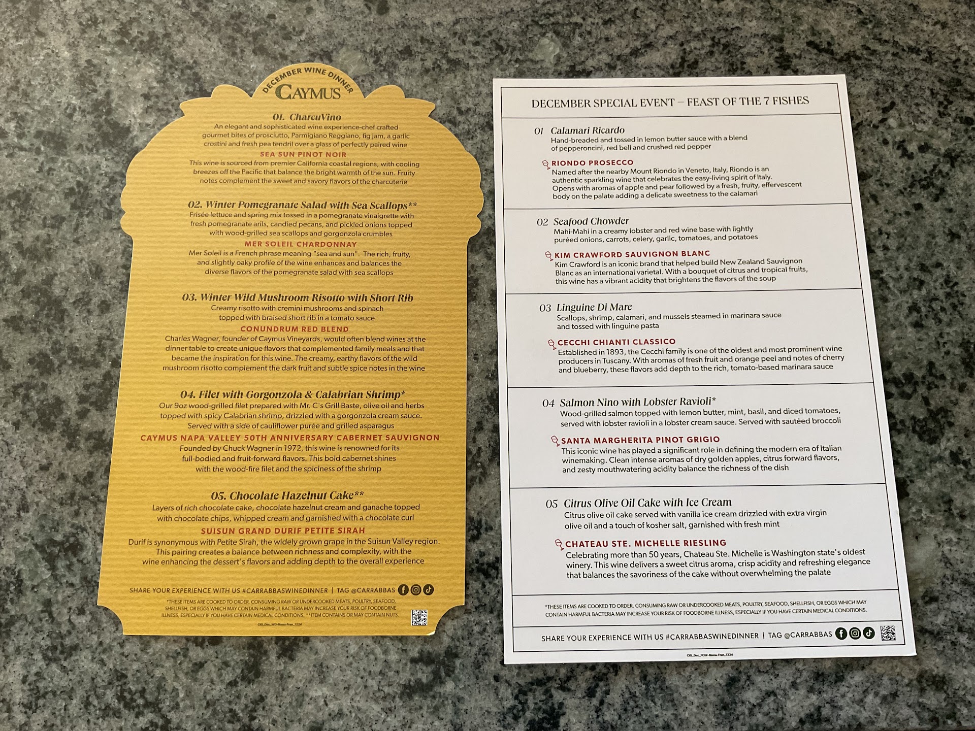 Carrabba’s continues to impress with their special event dinners and this event was no exception. You will have a chance to experience their fabulous wine dinner on December 3rd, which will feature Caymus Vineyards celebrating their 50th Anniversary. Caymus is known for its outstanding wines. It will be five courses each paired with Caymus wines.