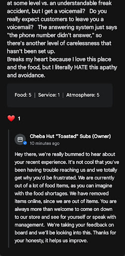 Something needs to change. I arrived home last night to see my mom struggling. The staff were so rude, disrespectful, and inhumane to my mother that the altercation almost literally gave her a heart attack. Her chest was burning and her stomach in knots even still today. She was holding back tears to explain just how unkind the staff had been treating her. I held her in a hug for a long time and I could feel just how much her body couldn't relax. It's insane how an establishment can be so poorly managed that it would lead to an encounter this traumatizing. My mother was even getting sympathetic looks and comments from other customers, they were noticing how horrid the staff were. One even said to her "don't take it personally, they don't like white people in here." It's the fact that other people felt treated just as injusticed, they felt it was a racial issue. Consider writing a formal apology Leaf, Maggie, and Angel, because it's disgusting and disheartening to have heard about this. My mother is a genuine person and never deserved to be treated the way you treated her, her heart could literally barely handle it. You don't know how kind, patient, loving, and giving of a person she is. Let alone a customer, you just don't treat a human being the way you did. It's akin to a bunch of kids bullying an older lady. The world doesn't need to be like this. Be better, do better. You can do it. It is crucial that the management step up to create a healthier environment for employees and customers alike. The staff shouldn't be stressed to this extremity that they don't have the mental and emotional capacity to handle the job, and to be lashing out and ganging up on customers. All around, I really pray that someone steps up to remedy the toxic environment. I see other reviews from now to a month ago expressing intense dissatisfaction from poor management. There is a serious problem happening at this location, and it needs to be handled with a mindful and mature mind and heart. I pray somebody steps in and creates some changes in management before something even more disturbing happens here. Nobody deserves what's...