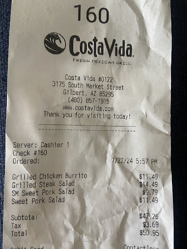 Read moreBeen meaning to write sooner. Went there a couple weeks ago and kids were excited to go to Costa Vida. Trying to watch 5 kids and flying solo dad, trying to order with all kids excited and being crazy. Went to order for twins after the older kids ordered and servers were typical talking loud to hear our orders and I realized they weren't wearing masks. Not just for the pandemic, but overall just thinking of the spit going into the food in front of them as they prepared orders grossed me out. But my other kids had already ordered and excited to be at Costa Vida. I ordered my food, paid, and took our food to the exterior patio to eat when I realized my burrito was just plain. I asked for raspberry chipotle burrito enchilada style and I received a plain burrito. Took it back in and asked for typical salad and pico along with some hot salsa. Kids had things missing too and didn't receive the churro thing that comes with kids meals. While ordering I noticed, first the masks, second the high schoolers that seemed to be just goofing off and no one seemingly in charge, and poor quality control on the food. Overall very disappointed with Costa Vida. This is not how I typically think of a franchise my family loves to visit. Needless to say we will not be visiting this facility again. We're still in a Pandemic! I would assume a very high profile (especially in the East Valley) dining establishment would take the high road to protect customers by doing the simple thing of covering their faces, if not for the pandemic, then at least for all the spit coming from talking over...