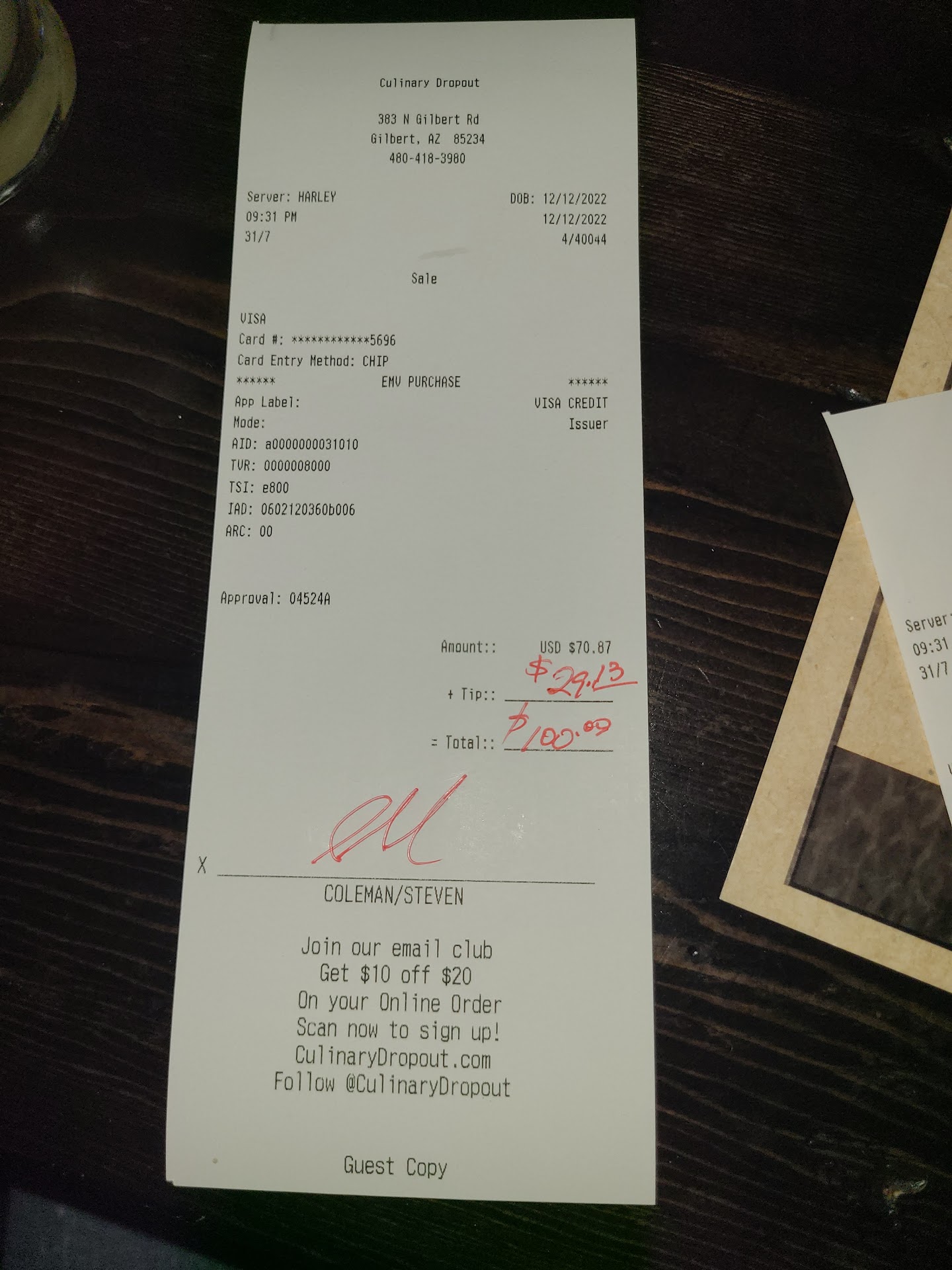 Read moreUpdate: Although this may seem like an unusual reason for a visit to Culinary Dropout, my father loved this place so it seemed like a logical choice for a Celebration of Life get together. Throughout the short notice planning for a large group, Brea was very accommodating to our requests. She listened to my story and proactively included my dad's favorite menu items. We used The Coop private dining space which was perfect for this event because it provided an apropriate level of privacy. Nolan and Nicki who helped with set up and serving were AMAZING to say the least. The food was good and replenished as needed. PREVIOUS REVIEW: We went to the Gilbert location as a group of 8 people for Father's Day at 3:00 p.m. Since we were there early, the restaurant was not busy. Despite the fact that we had a reservation, the host staff did not seem ready for us. In their youthfulness, the host staff does not seem to understand the struggles of guests with mobility issues. While they tried to sort out where to seat our group, my dad was left in the entrance area clinging to his walker for balance. When we were directed to the table, a staff member did not step aside to allow my dad an easily navigatible path. There was some confusion regarding who would be our server, but it was eventually determined that Harley would be assigned to our group. The drink menu is more extensive than the food menu. The drinks are good with one odd exception: they do not have ginger ale on tap and tried to substitute a combination of Coke and Sprite. We then asked if they served Ginger Beer, which they did. As a server, Harley was friendly and had a great sense of humor. We ordered many items off the menu: Chicken Katsu, Pub Burger, Salmon, Fish and Chips, Vegan Curry (modified with shrimp, Meatloaf, Sliced Beef Sandwich, Brussel Sprouts, Pretzel Bites, Popcorn Shrimp, Toasted Bread with Balsamic. With drinks, our bill was just over $300 which was fair for the size of our party. After dinner, Harley escorted us outside and took a picture of our group. Parking is easy and free in the nearby garage. It was easy to drop off and pick up my dad right at the door so he didn’t have...