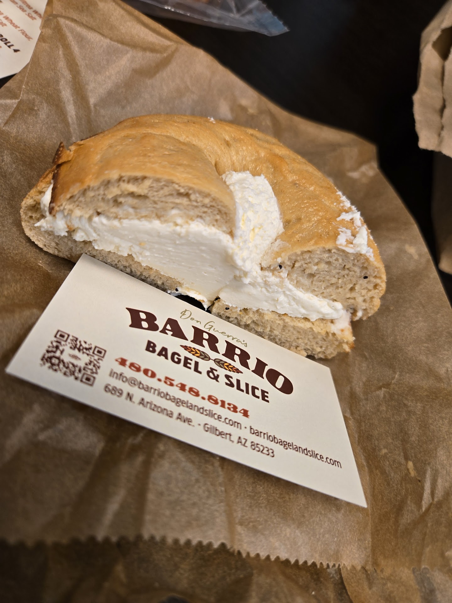 Don, it was great meeting you and your team today! This is your baby and it shows! We stayed at the In-town Suits ( best price on a place to stay $469 weekly, upgraded room daily $69) we noticed that Barrio Bagel & Slice was being worked on, alas we moved before they finished... today I had the time to take a look and disappoint Was never in the cards! Clean, friendly, spacious, lots of parking, homemade food with love! I asked for the everything bagel, but just after devouring the bagel, I thought, humm, I ordered the everything bagel with cream cheese and got the plain bagel with cream cheese. Non the less I am in no way disturbed by that! I don't know if you have had a real homemade bagel before, but when done right you get this amazing crispy, light and clean taste. Just throw dirt on me I'm done! With whipped cream cheese! About 1.5 oz of added deliciousness, I'm a fan of alot of cream cheese!