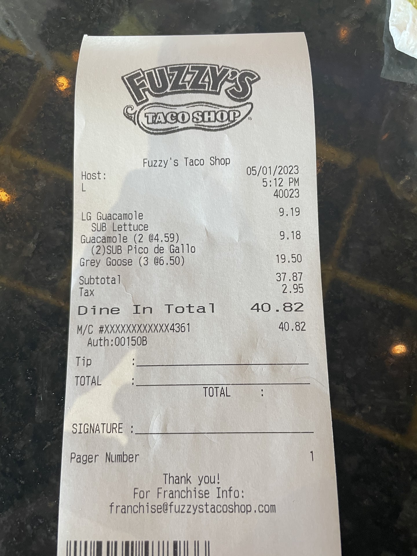 Read moreMyself and my entire family are loyal customers at Fuzzy’s Tacos Gilbert, AZ. We spend quite a bit of money there, however recent experiences have me questioning why we continue to come back.