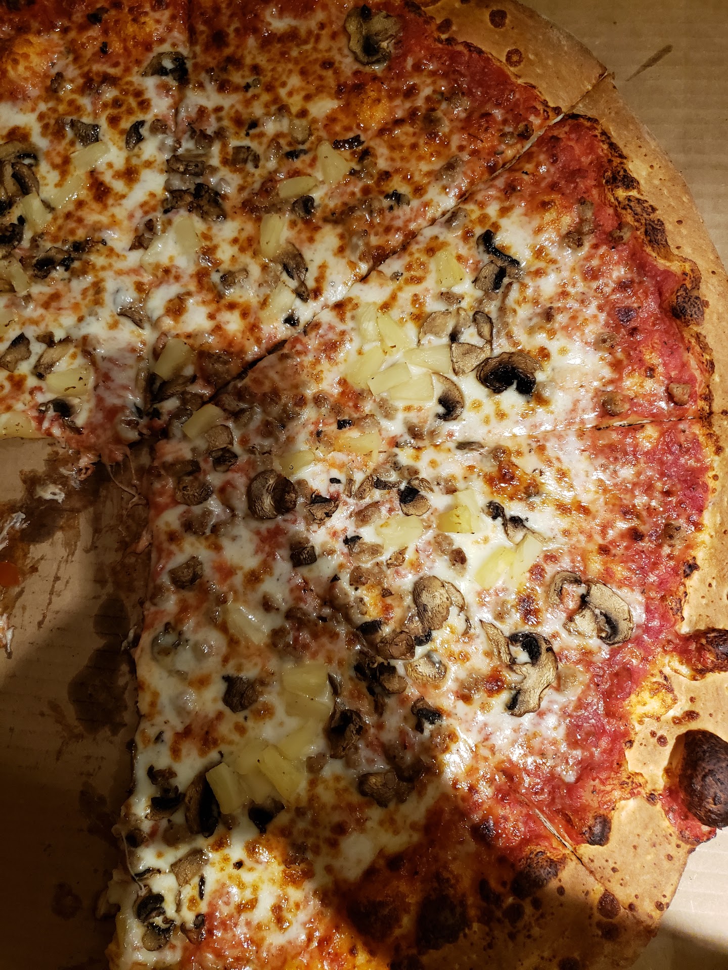 The next issue is I asked the young kid what the 24 inch pizza ($27) looked like....he pointed to the wall. I proceeded to order the 24 inch with two additional toppings ($3.50 per). I said I will order that with sausage mushrooms and Pinapple..Making a grand total of $34.00. If you are charging for extra toppings in relationship to size... I would (most normal people in general) would expect that the pizza would be covered to the near edge like all the other pizzas. BUT NOT THIS ONE!!!!! I recieved maybe 2/3 of the covered and the other having NOTHING. NADA ZILCH ZERO !!!!!