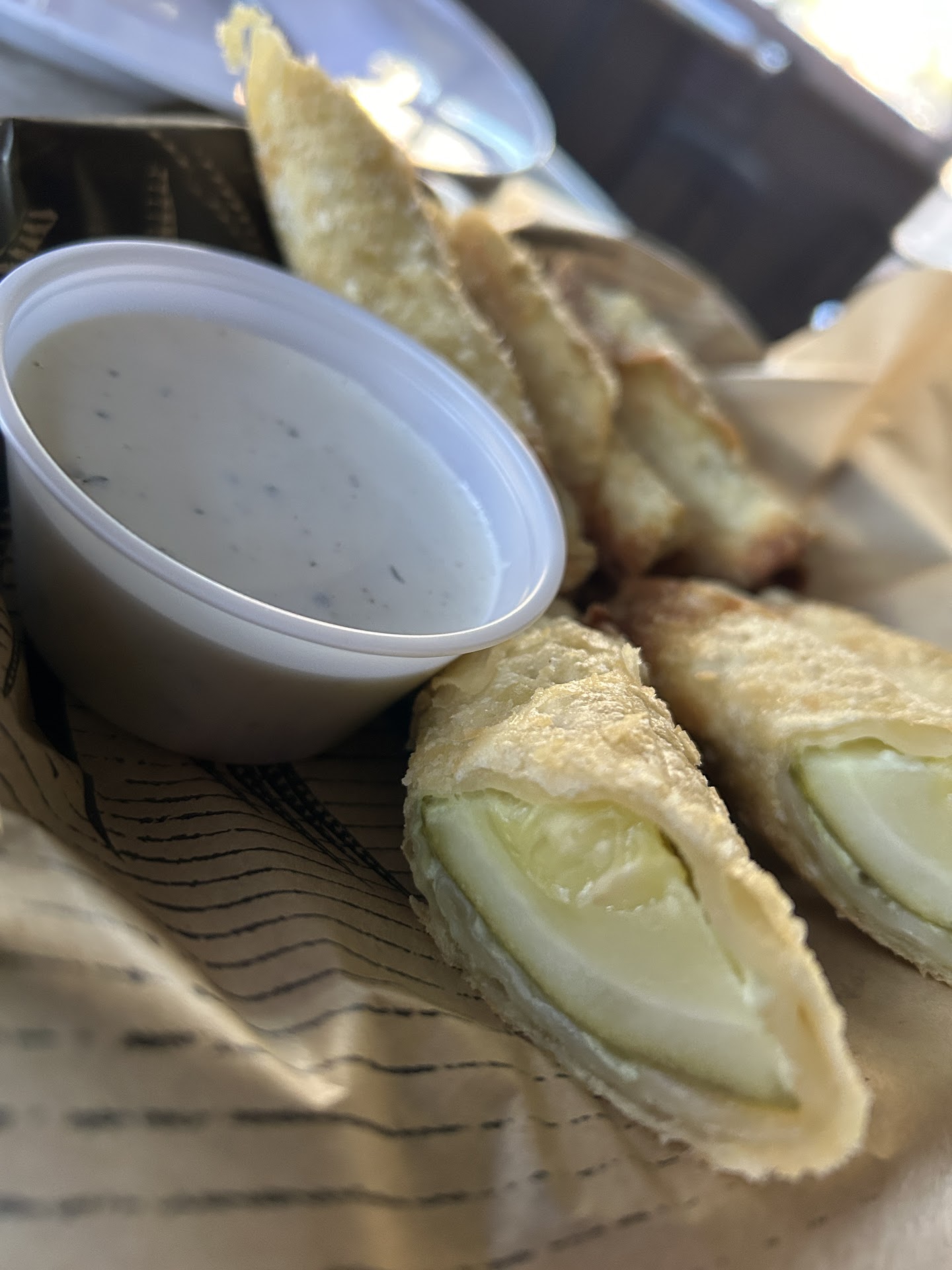 As we walked in, though, it started coming back: that we did not remember being overwhelmed by the previous visit. I must say though, this go around was much better. The food was hot, with a few different items on the menu. the two pretzels were huge, as well as burn-your-fingers-hot, plus the wanton-wrapped deep fried pickles were a nice addition.
