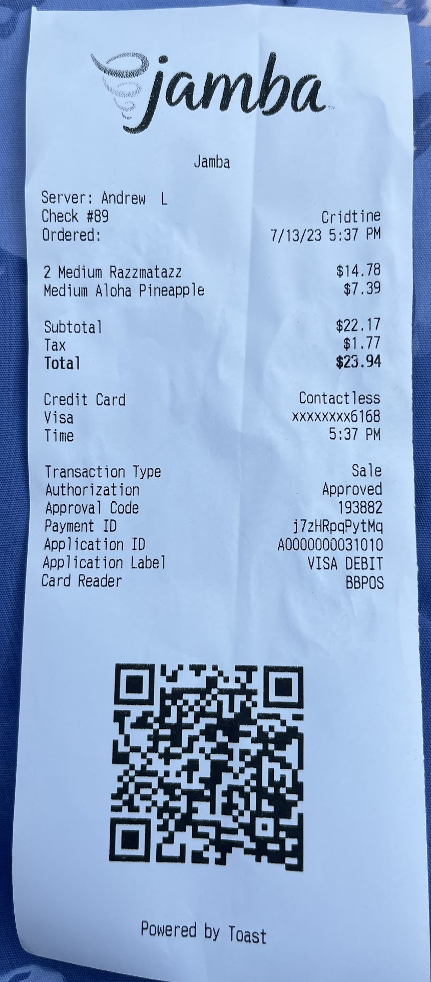 Was not greeted by either of the employees as me and my daughter walked in and stood at the register. The cashier, Andrew L. finally acknowledged our existence and said hello after I stared him down in awkward silence. His demeanor and shortness with me gave me the impression that he was annoyed we were there. After he took my order, he quickly walked away and didn’t return. I had to reach over the register and grab my own receipt let alone receive a thank you. Once the drinks were ready and sitting at the counter, he called out my name and then quickly walked away again to the back to start washing dishes. No ‘thank you’ was ever uttered by Andrew or the other girl working on 7/13/23 at 5:37pm. Andrew, if you hate your job so much and hate people, why not just get a different job? I’m sorry your manager did not provide you with sufficient customer service training, but it’s also just a matter of being a courteous...