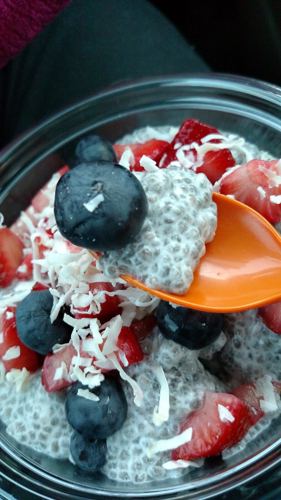 The JJ app is pretty, cool, & easy to use. I ordered a customized PB & Banana protein smoothie - added chia & pumpkin seeds + blueberries (all pulvarized); very yummy & PURPLE, lol, w/ the extra blueberries. I also ordered their new chia seed pudding, the Berry Berry Coconut option. It was $4.99; it looked quite small at first, in the container, but once I opened to taste it, there's actually a lot of food in there, & HUGE blueberries!!!...& It's quite yummy! Win...