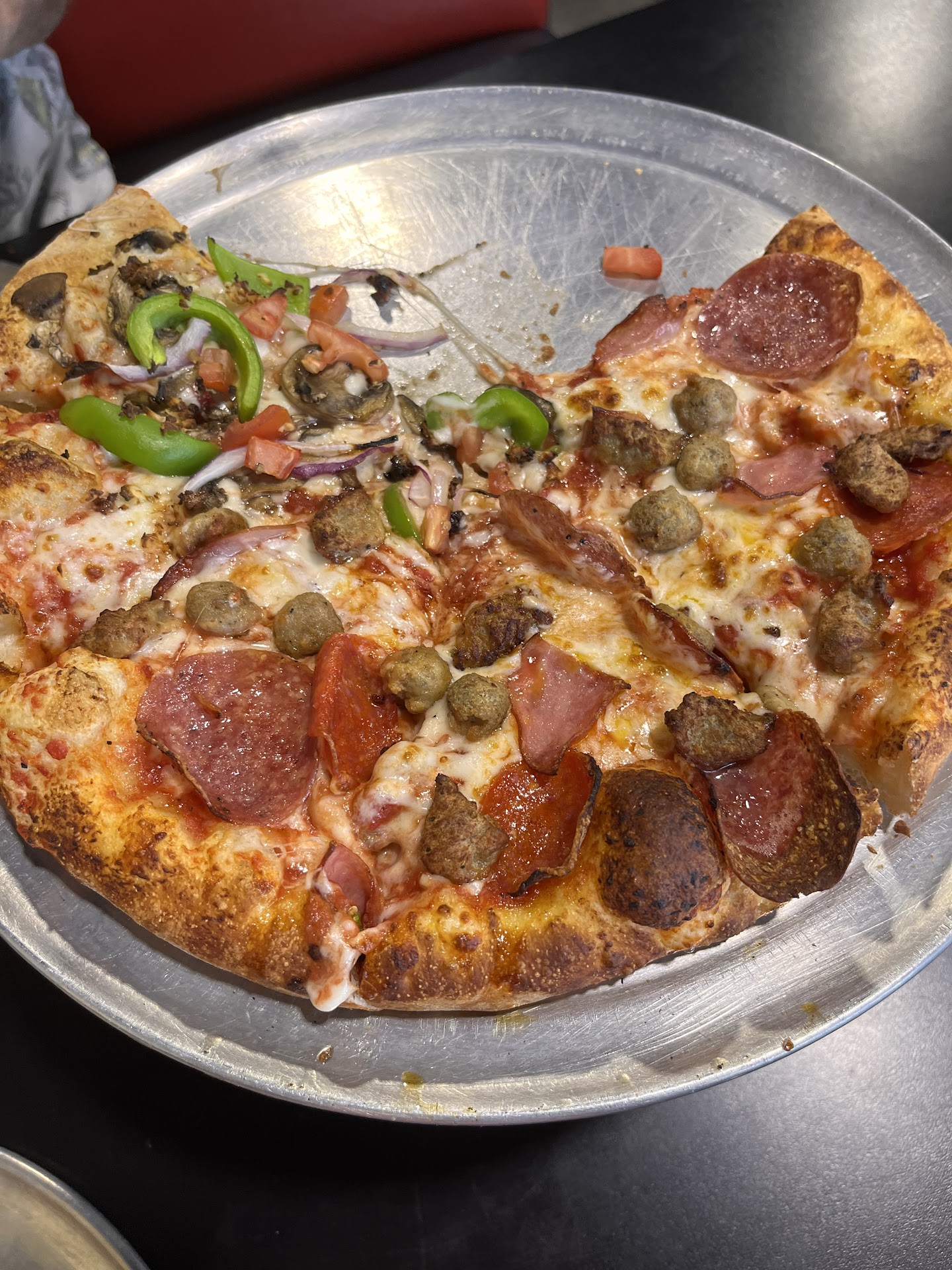 My wife and I eat pizza from all over the area from Papa Johns in Chandler to Barro's in Queen Creek and Vito's to Organ Stop and many more in between. So, we know our pizzas and pizza places. Right away we noticed the place was basically empty, one couple picking up slices. The young man at the register was nice and cordial. We ordered a 1/2 carnivore, 1/2 Veggie the vegi's were green bell pepper, red onion, mushroom, minced garlic and a smattering of tomato. The carnivore was well covered with pepperoni, salami, Canadian bacon and meatballs (sausage). Between the two halves the carnivore won hands down, I think mostly because there weren't very many veggies at all on the pizza then so little sauce the crust looked like it had olive oil instead of sauce. To be fair we've had pizzas like that before and you can really taste the olive oil, but this didn't come close to that. The Service was not fast since we were the only ones in the dinning room, but they did have a pickup while we were waiting. The pizza was very hot and fresh when it came out. The temperature inside the dinning area was probably in the upper 80's and heating up as the sun was setting and shining more into the front windows. The tea had something wrong with it, the cashier didn't charge us for the tea because he wasn't sure there was any when we ordered. My wife threw it out and got water instead. The tea looked dark like Coca-Cola but tasted like strange water. I had a soft drink which there was something going on with the machine because water was running out around the black spigot as you would tap out whatever flavor you would try. The pizza crust was strange had a nice rise on the edge and was well cooked on bottom, but there was an odd flavor on bottom. There are so many places yet to try and so many better than here we...