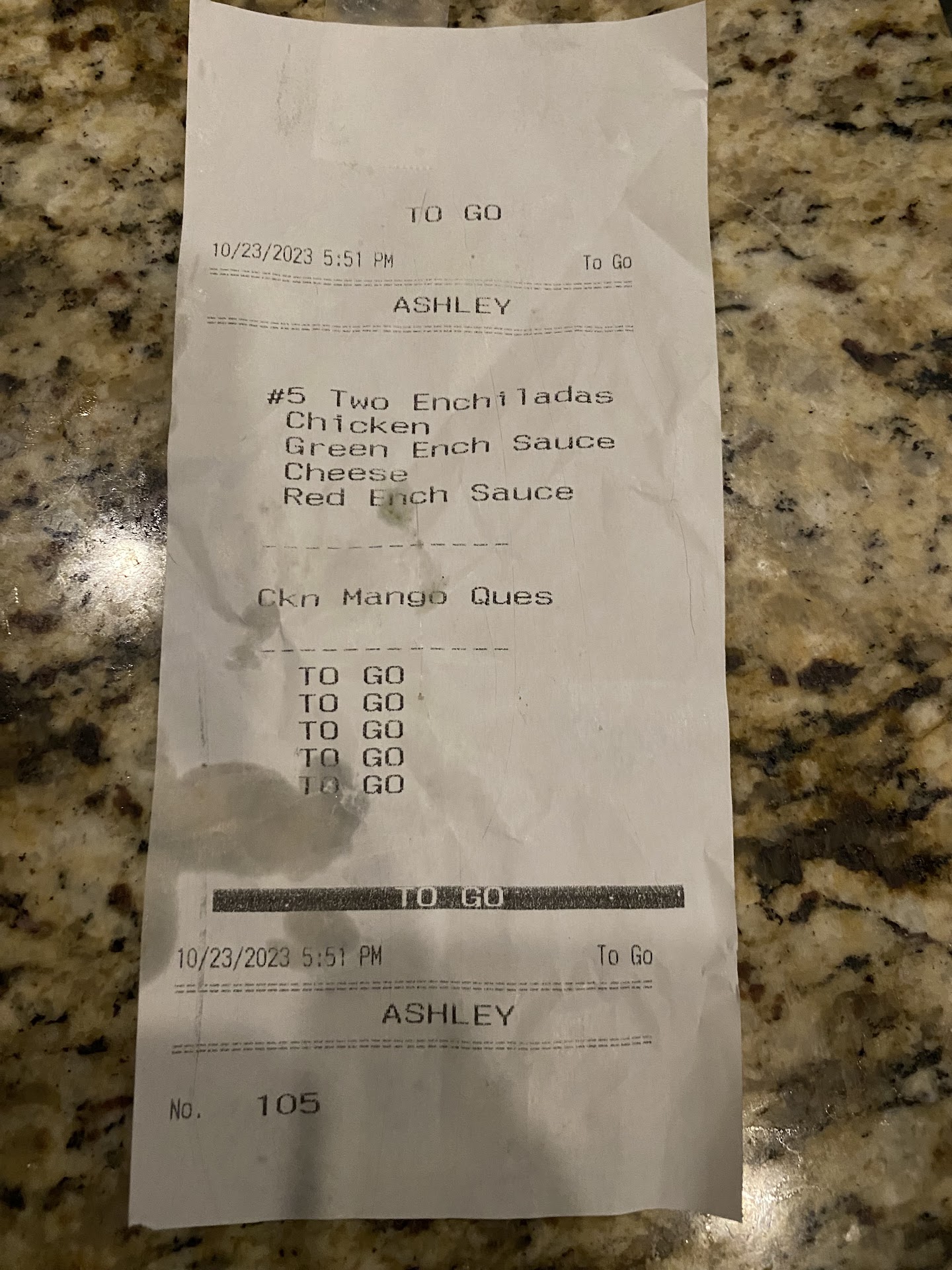 Read moreAfter getting vaccine from nearby, we decided to try this location. We love going to the Gilbert & Germann one. We already know the menu. Our waiter comes back to take our order, & he’s standing at the end of the booth. I start to tell him what I want & I see the gal with the tray that has our chips, salsa & bean dip coming at the same time. I don’t know if she tripped or was just walking too fast & just lost control of the tray. But mid sentence every comes flying at me. I was wearing it all!!! I even had bean dip on the inside of my reading glasses! The waiter apologized & got me rags to try to clean up but needless to say it was a disaster. The gal didn’t say a word!!! What the heck?!?!? The delicious food was so ruined by this experience. Not only that but they gave me a free fried ice cream to compensate. Oh really??? I couldn’t even eat my whole dinner after that. I was freezing sitting there in wet clothes. They could have offered to clean my clothes or buy me a new outfit or at least they could’ve comp’d my dinner if not our whole tab!!! I mean we didn’t order a bunch of drinks or run up an outrageous bill. But geez. Maybe they should train their servers to wait until the end of the booth is open instead of trying to hurry. It wasn’t like the place was busy or packed with customers. I understand that accidents happen & I’m sure she was embarrassed. But she still could’ve said something to me. Maybe they should have asked me what I...