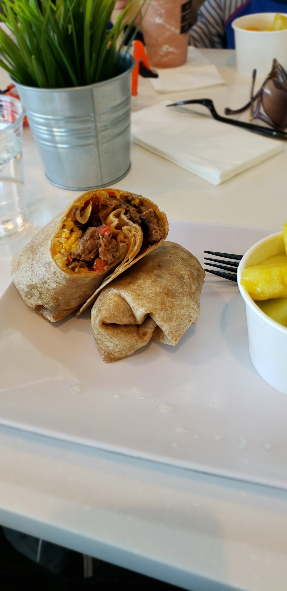 My wife got the Power Wrap and Ms. Skinny Shake. I decided to get the BBQ Bison "Cheesesteak" wrap. We both LOVED our food. The Bison was cooked the medium rare I requested, the wrap was soft and chewy, instead of dry like some places that use a whole wheat tortilla.