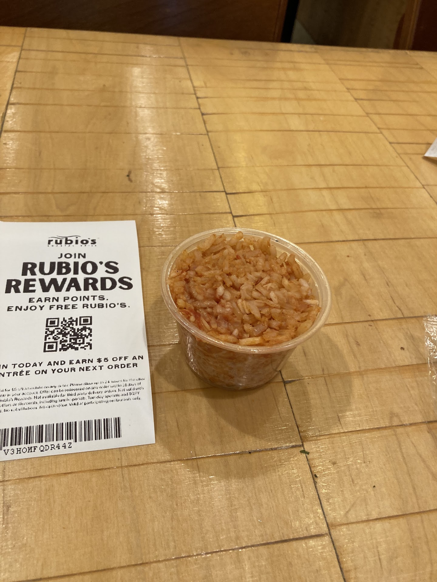 Read moreTERRIBLE CUSTOMER SERVICE. There's a rubios in casa Grande that I've been to and it's always delicious and fresh. First time going here. I ordered online and apparently, I " placed the order wrong online". So the guy at the front tells me they did everything correctly and tries to move on to the next customer without asking if he could fix my order. I told him I wanted it fixed with no tortilla strips and chili peppers, I even told them they could use the same fish. He chuckled and said UH OKAY. He proceeds to speak to the other guy in Spanish about me, not realizing I speak Spanish. They're sitting there laughing at me, it was extremely uncomfortable and upsetting. I just took my food and left. And as I get in my car I realize they forgot the corn... So I go back in and tell him, He checks my salad and then he gives me some corn that I'm guessing was sitting there all day because it was hard and dry. I got to work and realized they didn't put in avacado either... Save yourself a trip and avoid...