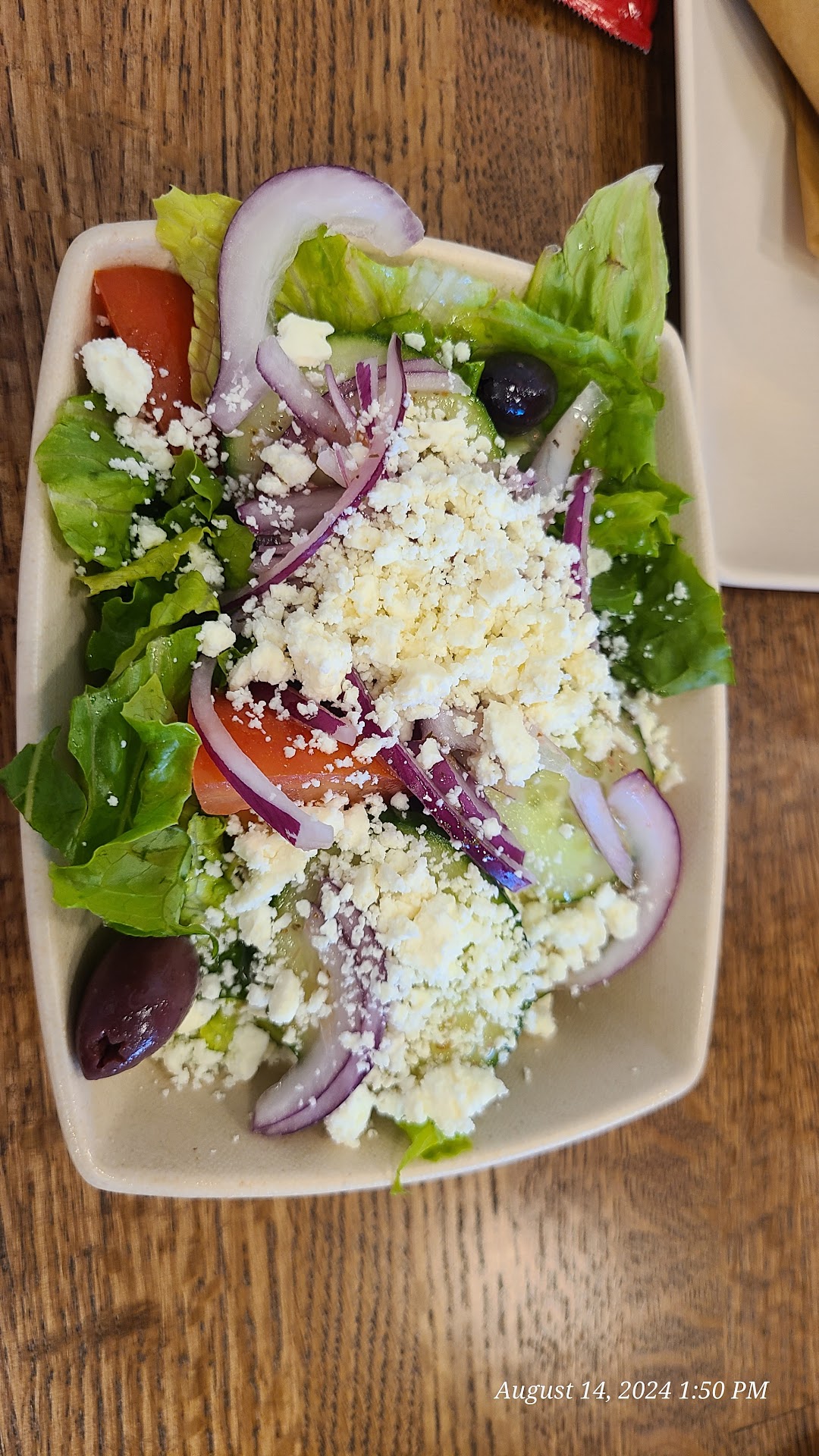 I wanted to like this so much!! Mediterranean food is my favorite and this place is just around the block from my house. We walked up last night 2/10 and the manager or owner (long sleeve, light blue button-down shirt) was out front and he said âhi welcome in,â very nice. We walked up to the counter, and we were half greeted by a woman who you could tell didnât want to be there. (Red polo, short hair, stretched lobes.) We tell her itâs our first time here. We order a steak kebab, a chicken kebab both with rice and a large Greek salad and the pepper/feta app to share. At no time, did she bother to tell us that the plates come with a Greek salad before the meal. Yes, I couldâve read the menu, but someone whoâs paying attention and in customer service could have made this experience so much better. I said it was our first time here which means we have not seen the menu and she knows how quickly we went ahead and ordered after walking up. Wouldâve been great if she wouldâve just thought to say did you know the plates come with a Greek salad beforehand? Needless to say, I have a full Greek salad to eat today because we didnât even get to touching it. The portions are huge, which is great since the meals are $18-20. The pepper/feta app was incredible! The steak kebab while cooked perfectly, was way over seasoned with salt. The chicken was okay. During our meal, a sweet young woman (black tee, burgundy-ish hair) came and checked on us. I saw her engaging with other tables as well. She should work the register since first impressions matter! Overall, it was just an okay experience. Considering my two favorite Greek restos are in Mesa and the other side of Gilbert, I may come in...