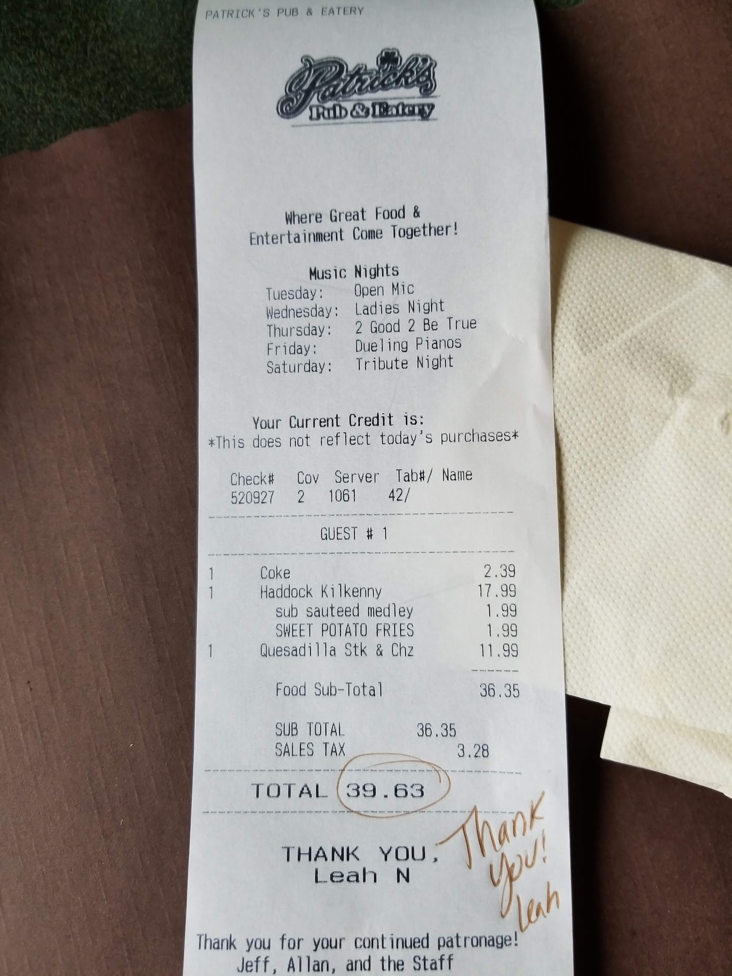 Read moreDisappointing experience with our family on a vacation. We had 3 small legally registered service dogs and when getting seated we told the manager and she was immediately slightly unfriendly about the situation. Her reactions were not customer friendly and made us a bit uncomfortable, especially when she broke the law and wanted to know if we had the correct papers. NH laws prohibits public accommodations locations to ask anything other than if the animals are to support a disability, and the tasks the animals are trained to perform. It is against the law to ask for legal documentation. We got seated and ordered appetizers but one of our pups was just barking spontaneously and when the waitress was placing our appetizers on our table the manager told us other customers were complaining about dog barking and if it continues we would have to leave. This is also not right as the law states we can be asked to leave if the animals are barking loudly at or intimidating other customers, and this was not the case. We were immediately turned off by her comment. Our dogs were not barking at anyone and was only barking sparsely. We just did not feel comfortable to eat the rest of our meal so we stopped with appetizers and drinks and decided to leave. Very disappointed since we came back to this place to reminisce when my husband used to come here on family trips to NH. We will never return to Patrick’s Pub and will also never recommend it to anyone . The only silver lining was Our waitress Julia. She was extremely polite and a great waitress. We would absolutely request her if she was working at another...