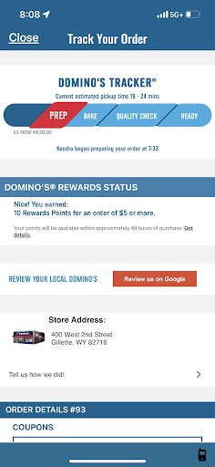 I got the notification that they had begun prepping the pizza on the tracker app. In the picture you can see that 40 minutes later nothing changed. I actually stopped in as there may have been a technical issue. They informed me that they had prioritized delivery and that I had to wait an additional 20-30 minutes. They do not do the orders in order of their arrival evidently. I found this to be highly unsatisfactory. Iāve used the app and ordered pizza here a great number of times. Iāve only ever encountered a snafu one other time. That was immediately rectified at the time to my satisfaction. I like many other people have decreased fast food ordering due to cost. So this rare treat was spoiled because they decided to screw over the non-delivery orders. This is going to make my use of this app or food service decrease to special occasion only with ample...