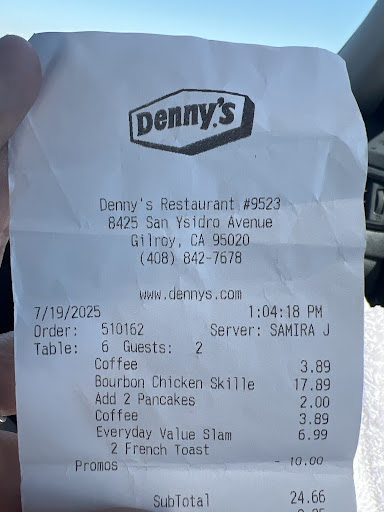 If I was starving, and this was the last Denny’s open in the entire world, I still wouldn’t eat here again. The waiter was rude, and he didn’t even know how to do simple math. Apparently they just hired somebody mathematically declined, who handles money. That isn’t a good idea, but to each their own. We ordered our food, and the first thing we ordered was our son’s food. To top it off, as we ordered he kept rushing us and cutting us off. He had no manners or decency. All of our food came out first, except for our son’s. Our son is a year and a half old. We shared our food with him, and 20min went by with still none of his food in sight. Waiter was a douche and never checked up on us once. I had to speak up myself and ask him where our son’s food was. He spoke with the back for a minute, and came back out claiming it had to be remade. How hard is it to make a kid’s burger and fries? Quite honestly I would’ve saved everyone time if I just went into the back myself and made the food. It would’ve tasted better too. The cook was flirting with the waitress most of the time, and he was hardly focusing on his job. Management was no where in sight. Whoever is in charge of staffing here, maybe you should hire people who know how to do their job correctly. Horrible service here. To top it off, the waiter had the audacity to try to screw us over at the register. He charged our double cheese burger as a single cheese burger, with an extra patty. This made that order over $17 afterwards. The menu says it’s in the $16 range for a double cheeseburger. Then he told me to come behind the counter and look at the screen, since I didn’t believe him. I looked, and it still was incorrect. Magically, after I complained the bill dropped $5 to the correct amount that it should have been in the first place. My change was supposed to be $15.01 after paying, and he gave me $15. I just gave up at that point and figured he could have the 1 cent tip, since that directly reflected the service that we had here. It’s sad and disturbing that they’d let a child starve like that. Thankfully we had our food, and we could share ours with our son. The waiter was a douche and shouldn’t be working in food service. If your job is that hard, go find a new one. This place was not kid friendly and the environment was horrible. Not once did he ask us for a refill either. He was in the back most of the time, doing whatever it is that management...