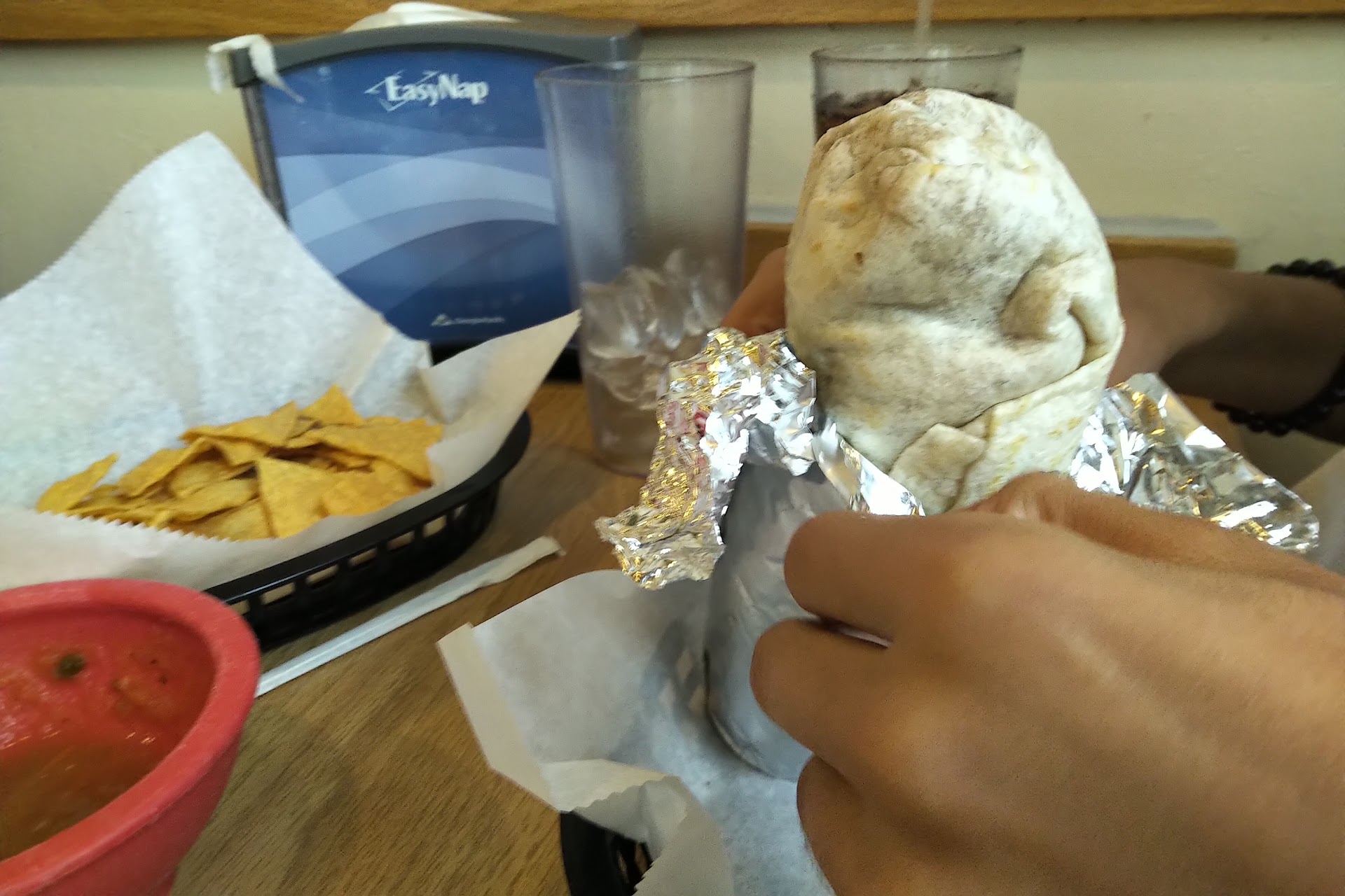 Margaritas were awesome. Huge glasses with all the right ingredients. Happy Hour during Cinco de Mayo $5 Margaritas. Two are just fine for the night.