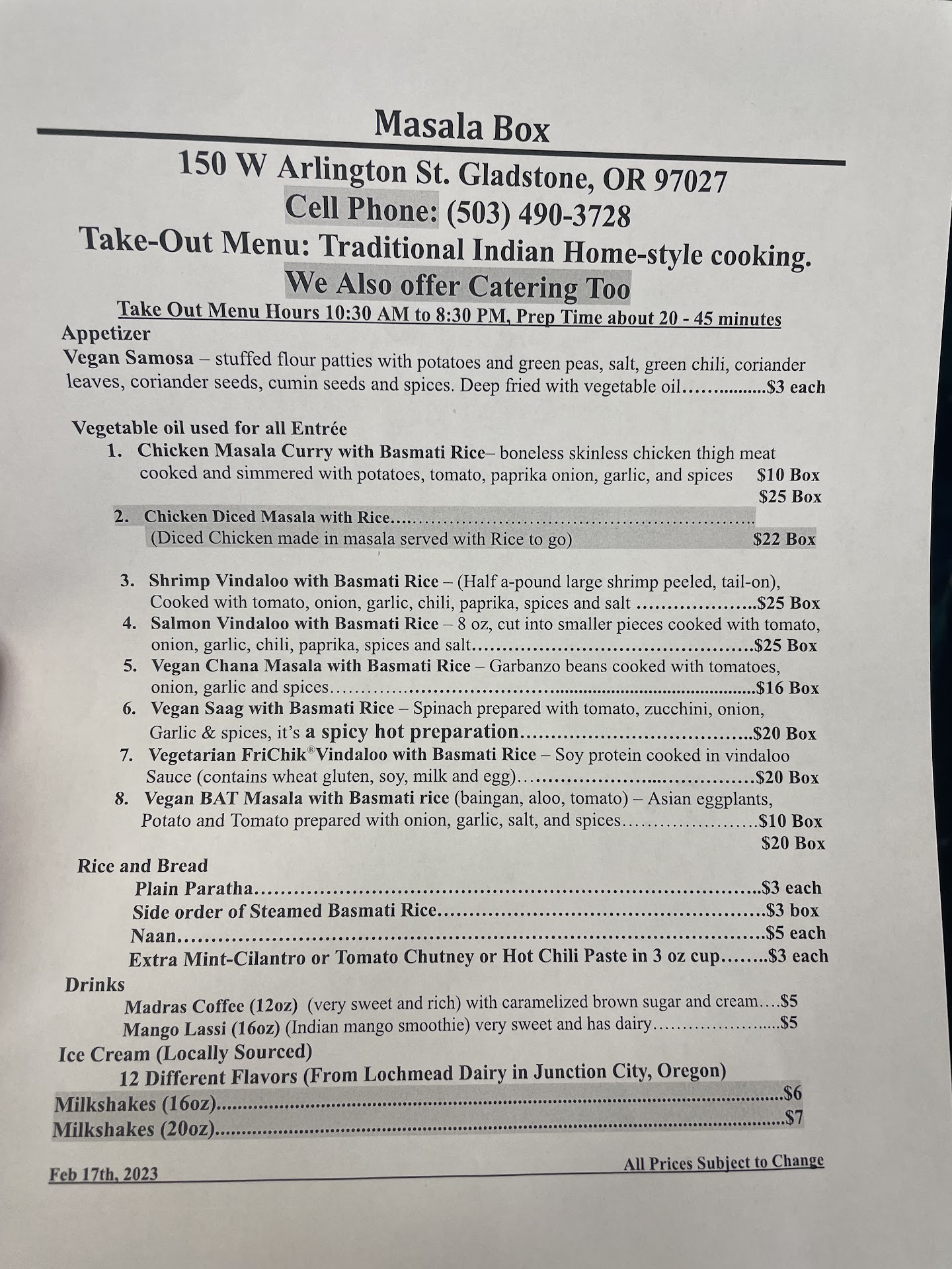 This is the best food I have ever had!!! I was Hesitant at first but I tried it and was blown away and in the past week I have had almost every meal except breakfast (which I usually skip) here at masala box!!! I live very close within walking distance and the prices are amazingly fair for the quality and quantity of food that you get. The owners are the most incredibly nicest people I have honestly ever met in my life and really show their passion in the food that they make I plan on eating here as much as I possibly can because it’s extremely healthy and is so filling! I usually get the Chicken Masala Curry full size and it usually takes care of me for dinner and lunch the next day the way I have it prepared is one step above medium so it’s got some really good heat and absolutely AMAZING AND DELICIOUS flavor!!!! I will definitely recommend as many people as possible to come enjoy the some truly authentic Indian cuisine that is made fresh every day with the best ingredients. I have had many other experiences with “ authentic “ Indian cuisine and nothing can ever hold a candle to the Absolute perfection that is served at the Masala Box. To be 100% honest when I enjoy a meal here I feel like a part of a family. From the bottom of my heart I thank you for just...
