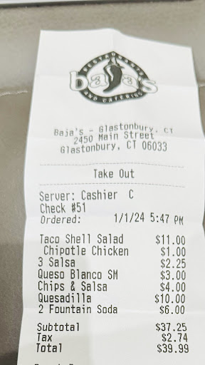 Read moreBaja's Fresh Grill in Glastonbury, CT, is an absolute gem! The food here is beyond amazing - it's fresh, flavorful, and crafted with genuine expertise. What sets them apart is their generosity – unlike other places, they don't nickel and dime you for extra ingredients, making your meal truly customizable without breaking the bank, a refreshing change from places like Chipotle or Moe's.