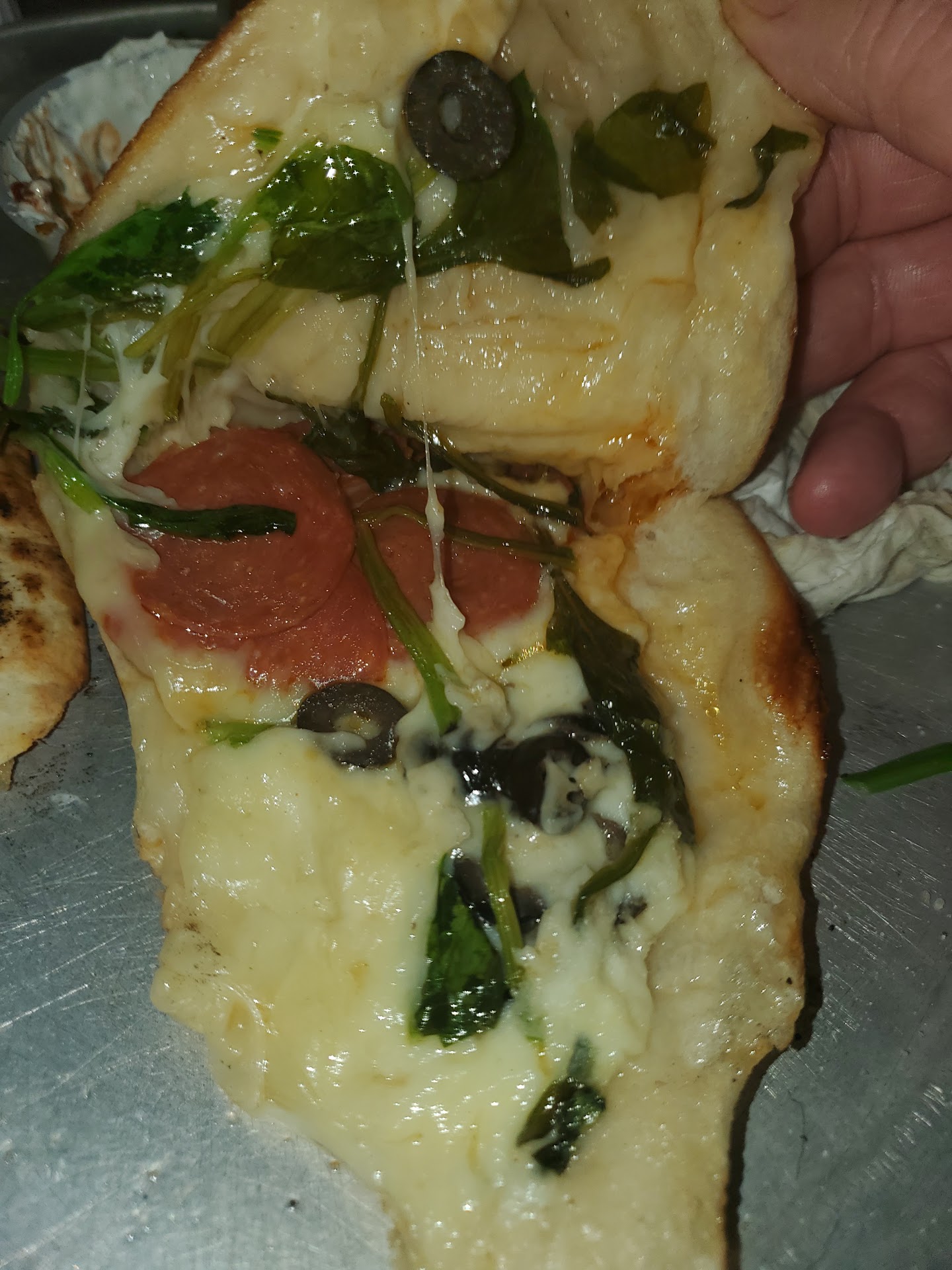 I usually go here for lunch and they offer pizza-by-the-slice. I enjoy their "meat stuffed pizza" which is a large slice plenty for most appetites. Once in a while I will go for a slice of the "buffalo chicken". They offer vegetarian slices too. On average they have around 10 varieties of pizza-by-the-slice.
