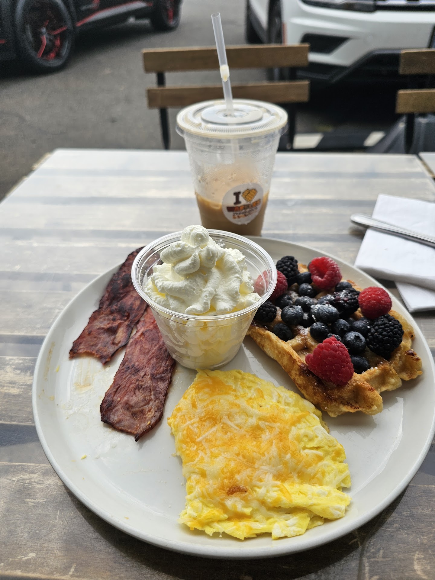 This was my first visit today and it wasn't very impressive. It's located in a very old, outdated, dangerous (parking lot layout/needs a lot of repair) plaza and this is someone's first impression of this place from the outside. There are then only two whacky sized parking spaces reserved out front. The inside is the total opposite of the outside; it's so beautiful inside so, great job there. When I made my order, I said it was "to go" and another employee came out of nowhere with a special map because "to go" and "online order pick up" orders have to be picked up from a drive thru window that's only accessible via following the map. That was very, very weird and confusing because when I did find the pick up window, it was behind and then around the building a little in this insanely narrow one way drive thru/exit area. What made that area worse is that traffic seems to be allowed to go through there but can't if someone's waiting at the drive thru. This whole part of this first trip at this was just so confusing and weird. Oh! Also, let me mention the GIANT potholes and blind exits that you'll encounter on your entire visit here. Don't get into an accident and/or damage your car! Finally, the food. It was okay. I got the waffle loaded with berries and added whipped cream for a small additional amount. The waffle was ok, the berries were cold and just added in as a side basically, the whipped cream was home made and delicious, and there was no syrup added. Altogether, I feel like this place rushed in here and opened without being completely ready. I might be back but I don't know. Especially since the...
