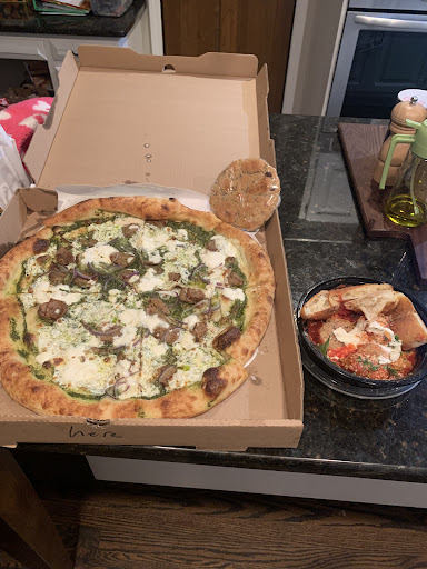 Anyways, we just ordered the pesto and sausage pizza and nothing else. When it came out, it looked and smelled fantastic. It has a pretty decent undercarriage. The crust is crispy but it will become very chewy when it gets cold. I really loved the flavor. Tons of pesto and sausage. That hot honey really adds another layer to the flavor. The fresh mozzarella was one of the best I’ve ever had. This pizza was definitely a step up from last time. The service was wonderful, the waitress was very attentive and checked up on us often. Highly recommend checking them out. About a 4.5 but I’ll round to 5.