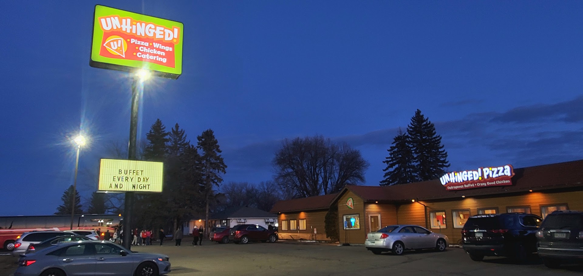 Always love how everyone is happy to help! Very polite and courtesy staff. Any special pizzas or requests that we would like when purchasing the buffet are made a too priority and delivered table side with a smile!!Starting on a positive point...we love that they delivery to our town which is 20 mins away. Our food is always hot and as good as going to the buffet. The delivery drivers are so polite and courteous! Even on the coldest n worst winter days they always get our food in a very timely manner with a smile even though we know it was probably a horrible commute! Those are the days I'm more then willing to pay the what I consider to be very high delivery fees. I honestly think Unhinged should drop the delivery fee and let us, as customers give that fee DIRECTLY to the person who took the chance driving all those miles! When the price of food continues to rise in every restaurant it makes it harder to find a way to help cover the delivery cost. Which makes it harder to tip the delivery driver, who puts their life on the line bringing the out of town customers their food on horrible MN weather days!! I understand that gas prices are rising and something has to cover that additional cost. But the delivery fees are way to high, which makes it really hard to afford to tip the drivers what we as customers think they truly deserve. I know it's a hard business decision, but i think this is 1 way that Unhinged could attract good dependable employees! One last thing, we went to dine in earlier this week and were COMPLETELY SHOCKED when we seen Glencoe only has ONE HANDICAPPED ♿️ Parking spot. The much easier 2 spots to park are now for pick up orders. That makes no sense to those of us who have physical issues walking into the building. Especially because it was soooo slippery on both sides when we got out of my car to walk inside. Does it honstly make sense for 2 designated Pick Up parking spots to be the 2 closest spots to park? Donthe customers in those spots go inside to get their food? Or do the Unhinged employees bring the food out to the cars? Either way persons with disabilities are put at a much higher risk of falling on the ice to go both inside to eat and walk back out to get into their vehicles. We actually asked if Jason was working when we seen this. However he was off that evening. We didn't recognize the name of the manager who was working...and we know if you want an important situation dealt with Jason he is the 1 that will get it taken care immediately! He's one of the best managers in the business! Overall we love Unhinged!! And will continue to frequent this restaurant and/or get or food delivered to our house in Arlington...I just thought I would take a few minutes and suggest some things that could make things even better! The Glencoe Location is the ONLY location we ever go to! It is by far ran better, has a much larger selection of food items, has much fresher food and the best service of all the Unhinged and/or Pizza Ranch locations that we have ever been to! Keep up the great work!! The employees are the best ones...