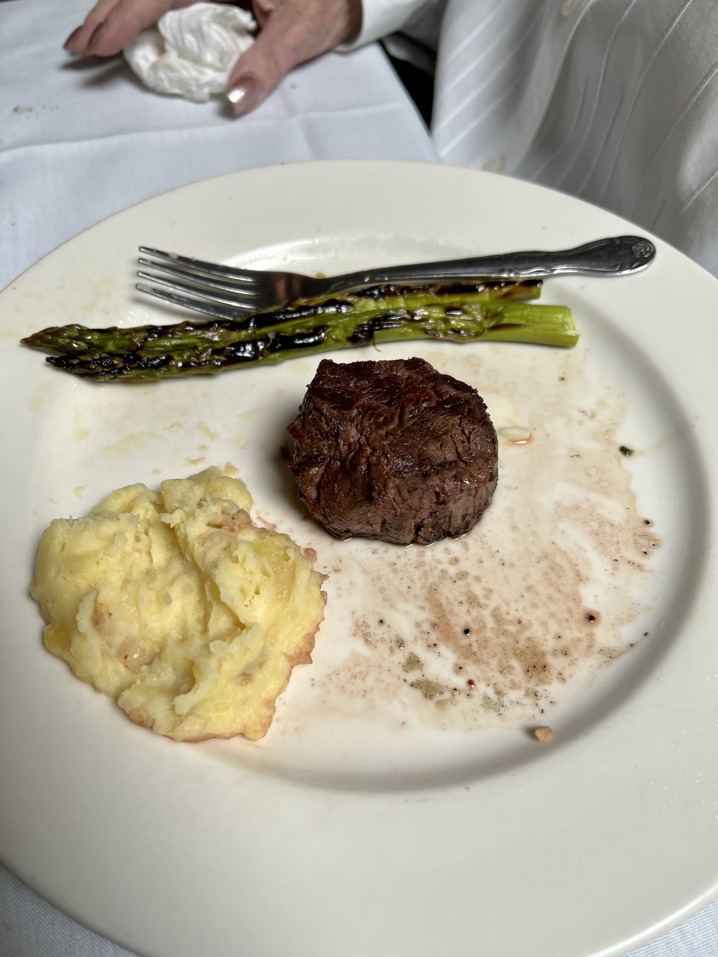 My wife's filet was a pathetic, scraping the bottom of the barrel, piece of meat.This actually redeemed the meal quite a bit as we were laughing so hard at what she was served. It inspired us to video chat with some family to say hi and share this piece of roadkill she was served. Lots of laughs all around!