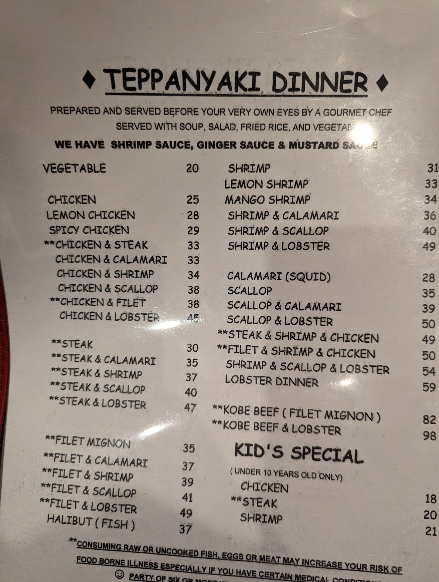 Read moreI saved up for 2 months to bring my daughter here (my problem not theirs) for her high school graduation present & mom & daughter time. Was so excited for her first teppenyaki experience. We joined a couple who were already seated. The "chef" came & instantly started talking to the other couple in Spanish. We were all smiles & truly engrossed & thankful for his skills or lack there of. Just thankful to be there. The other couple not so much. Talked to eachother, took a cpl pictures. The chef kept his attention on them, spoke in Spanish with them & hooked em up with half my daughters meal I paid for . I ordered filet & shrimp for her, vegetables for me. They ordered chicken & steak. But got the majority of the food & my daughter got 2 shrimp. They got 4...didnt order shrimp. I'm all about a hook up! But not at my expense. I was going to tip him $10 but tipped $5. They didn't tip at all. The servers & host was incredible. I didn't want to make a negative experience for my daughter & kept my mouth shut. Felt cheated when we left & won't be back. You never know a customers worth or value. Treat all equally. You never know what people are going through & the sacrifices made to go. Spent hundreds there in the past before life kicked us in butt & one day we'll be out of this but again, treat each customer equally & hook up secretly & not on another's dime! Idk how to upload the order but I did take a pic. Not a Karen. Just not ok. Again, the server & host were incredible (I tipped graciously) & me & my daughter enjoyed the environment & talking & walking with...