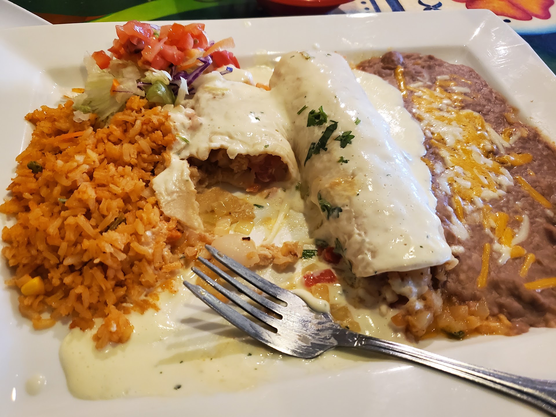 Read moreI personally did not care for the food, which was really disappointing because I wanted to like it so much. The restaurant is decorated cute, and everyone was so nice. I have been looking for a Mexican restaurant here to replace our beloved go-to Mexican restaurant back in Chicago, so maybe my expectations are too high. So far the Mexican food here doesn't even compare. I'm assuming it's because customers here don't know what good Mexican food is and they accept this food as that. The rice and beans were fine. The chips were fine, the salsa was too spicy and not enough flavor. My boyfriend had enchiladas. I had chile rellenos, it was ok. It wasn't terrible, it just wasn't good, the sauce was very strange. I actually wanted cheese enchiladas with mole sauce, the mole sauce was very good, (they let me try a cup of it before ordering) however they are not on the menu, which is peculiar, because not everyone eats meat. They said they could make cheese only, but it would be the same price as the chicken mole ones. I don't think so. If chicken is more expensive to add, why would I pay the same price for cheese only. Then the worst part of all. I understand Chihuahua cheese is expensive, however if you are going to charge the prices they do, then I expect real Chihuahua cheese, not orange cheese out of a bag. The prices in this restaurant were high compared to restaurants in Chicago, and some other places around here, and they don't even include items on the side. With the entrée I got a tiny pile of shredded lettuce, no tomato, no sour cream, no cilantro, no onion. It was a very disappointing experience, I will not be going back here. I am still looking for amazing Mexican food if anyone has any...