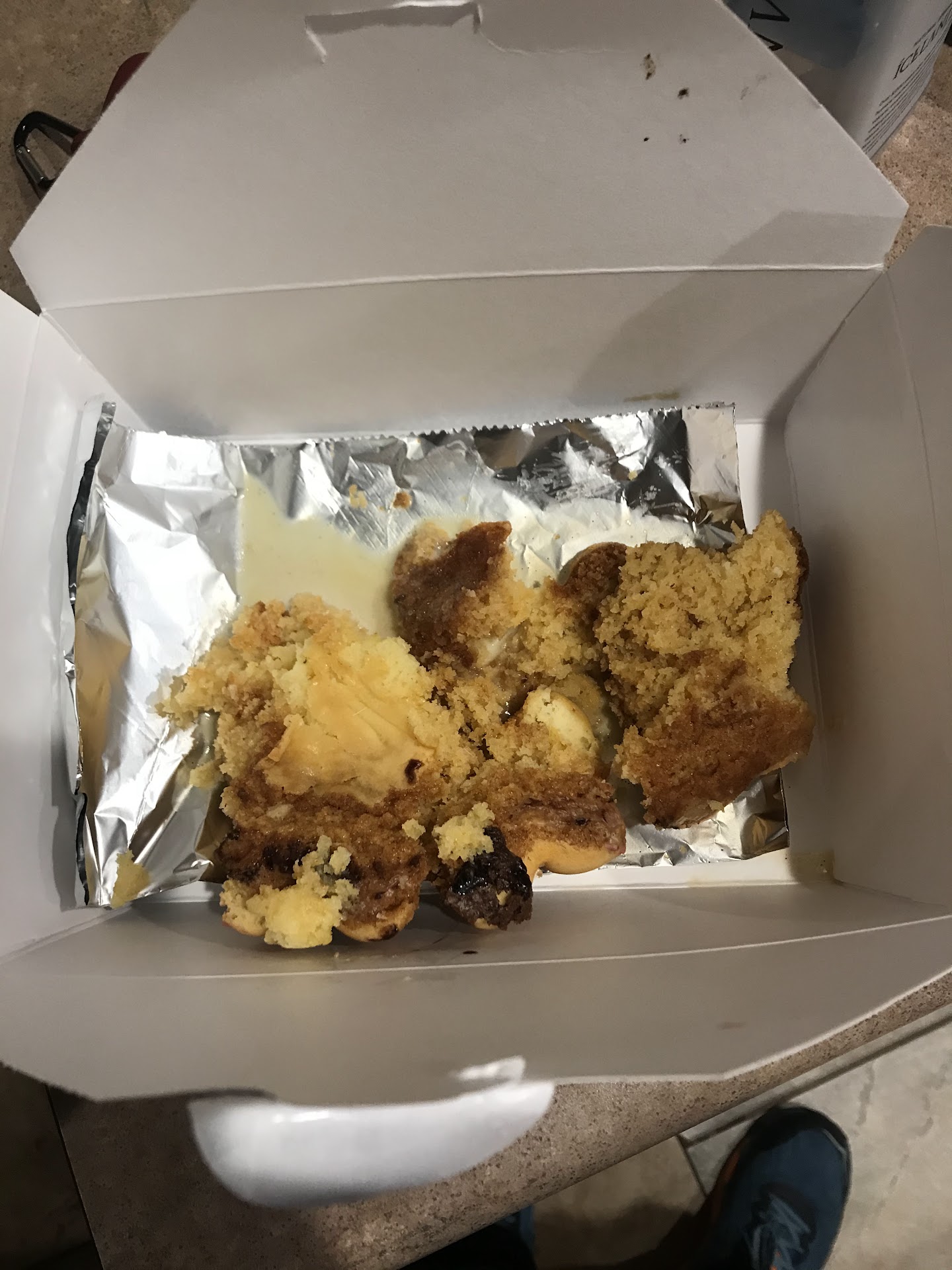 Well, when we got home, I found that the cake was ridiculously deconstructed as shown in the photos below (which we discarded for our instinctive personal safety) and our leftover green beans went missing because they were not in our take home boxes. We still left a significant gratuity because we know what its like to work in the service industry.
