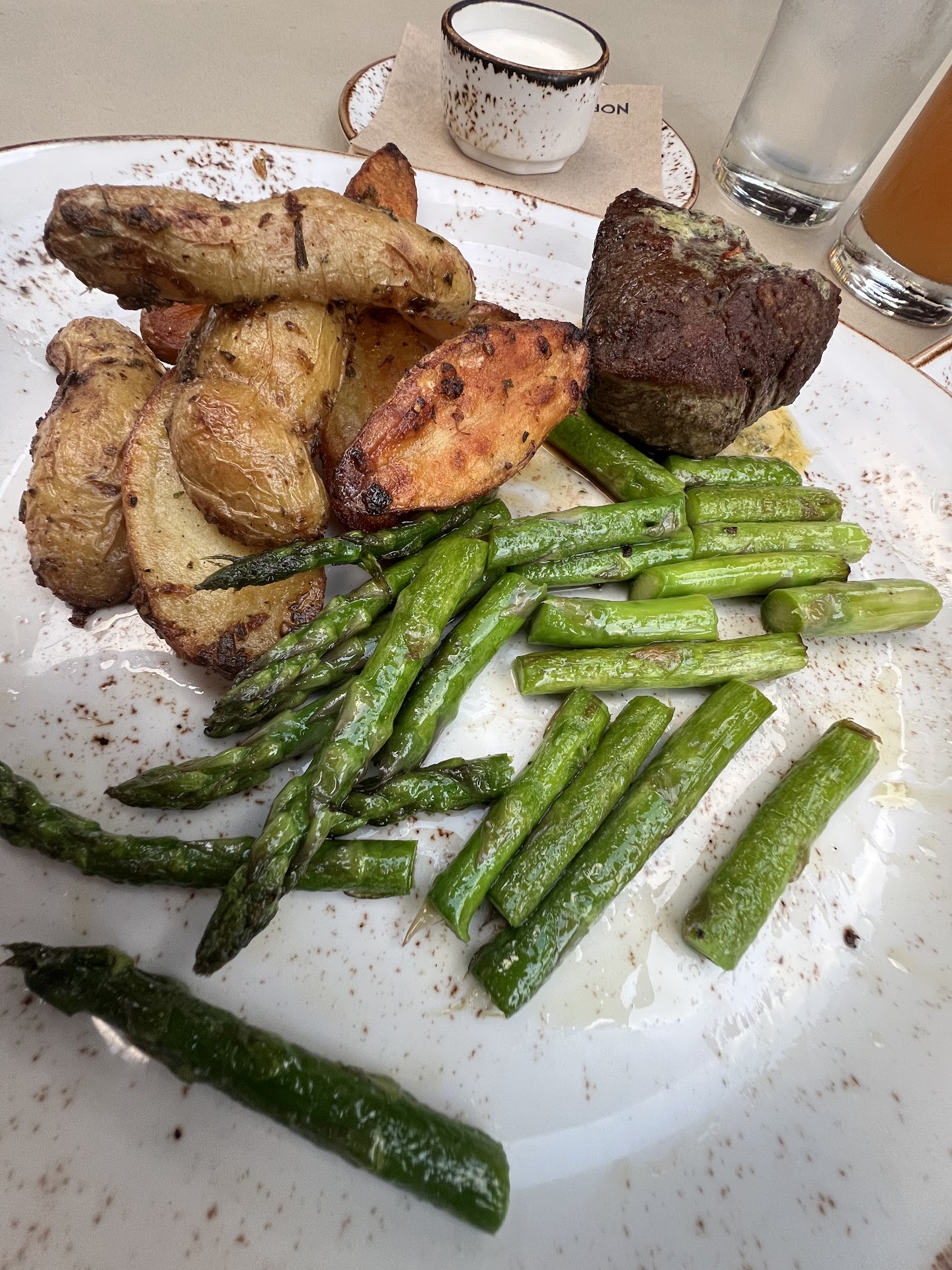 Calamari was well seasoned but not impressed with the size. The squid pieces were quite very small. $40+ for a steak with roasted potato and sautéed asparagus is kinda overpriced for me, i had steak plates with the same price but with more sides (especially what you see in the picture). But the steak was well buttered and seasoned along with the potatoes and asparagus. The Tequila Sunrise was fairly impressive, it was just sweet for me. Barely felt any alcohol
