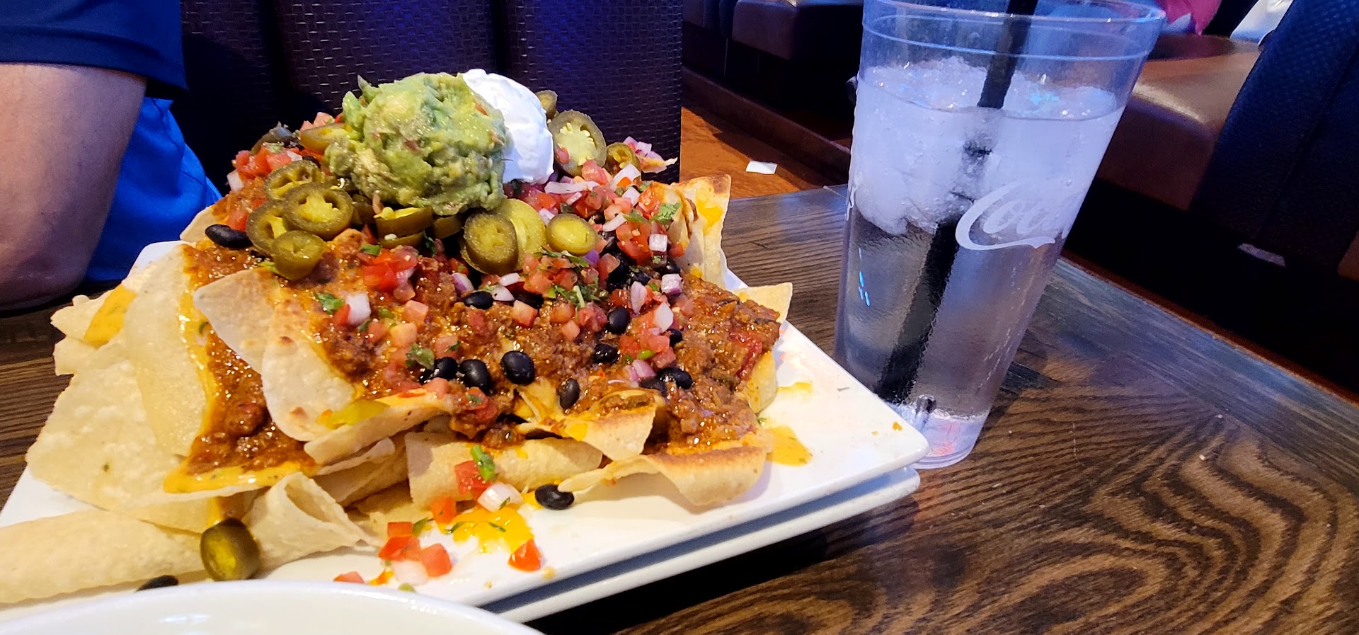 The ambiance wasn't bad - kind of like a typical sports bar. Everything is open air, but there were cold air vents and very powerful misters - so powerful you wonder if your food will stay dry - outside. The staff was very friendly and welcoming. The music was ridiculously loud - my son and I had to yell to speak to each other across our small, 4 person table, and my wife sitting next to me struggled as well. I don't want Cher at concert level volume in my ear while I eat, but maybe I alone on that.