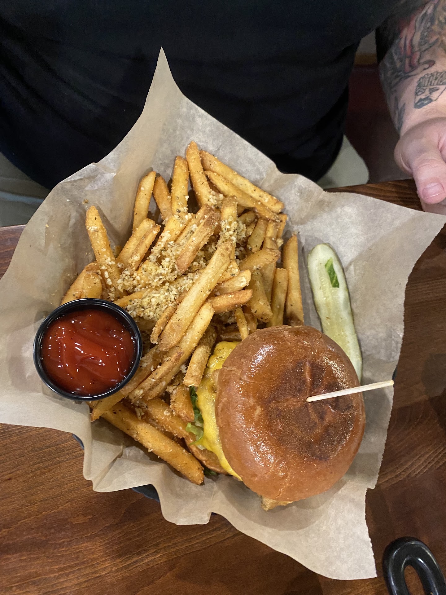 The Lucy burger was a little disappointing. The waitress explained that all of the burgers including the Lucy burgers are cooked to a medium. But the one what was served to us was not medium. It was over done. We upgraded the fries on this burger to garlic Parmesan fries. The garlic on the fries is super flavorful chopped garlic.