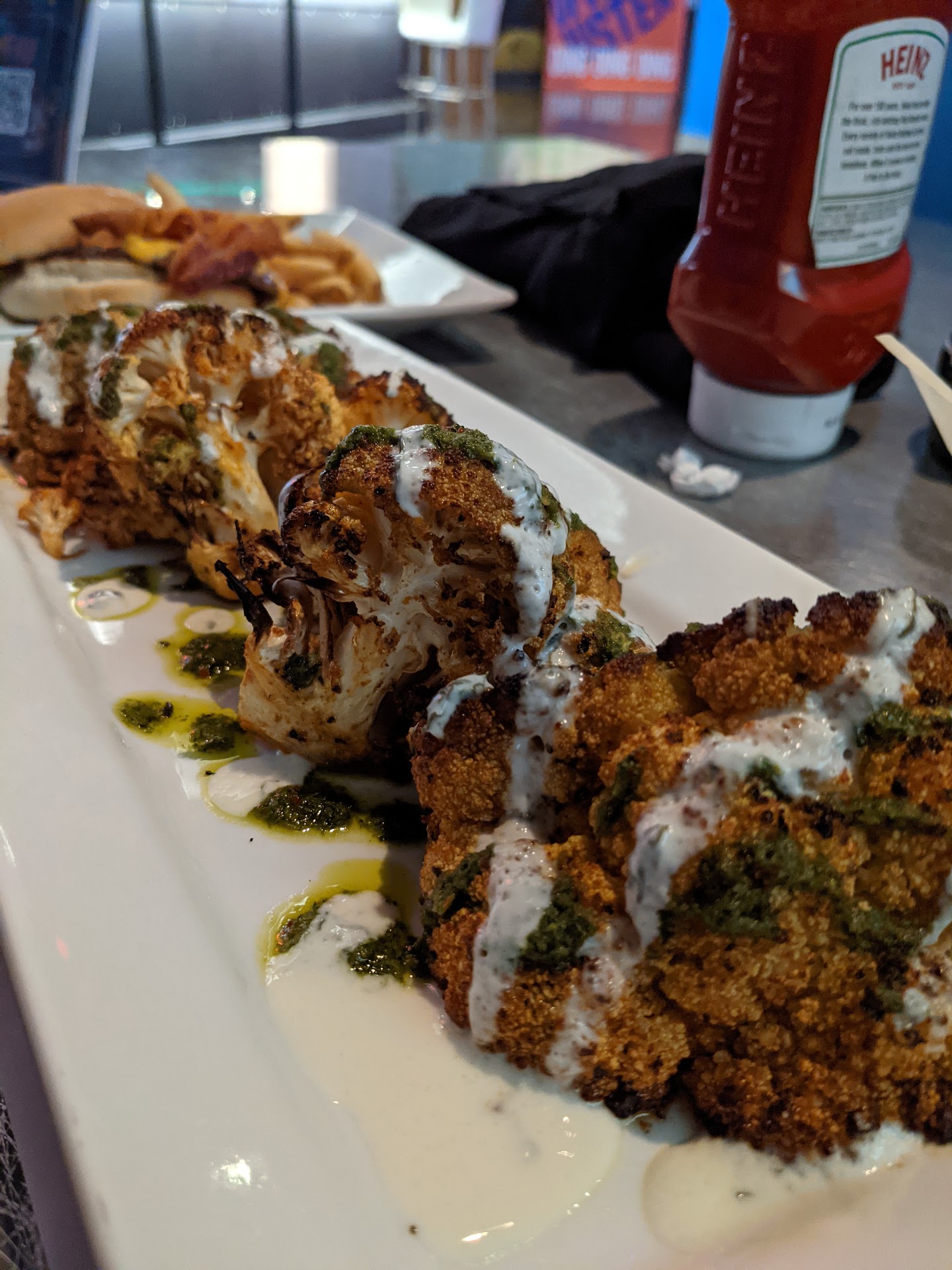 Came here on Monday October 18 after the Coyotes home opener. Arrived at the bar at 945 PM. Was told food is available. Sat and ordered a beer and a mixed drink. Asked for a water and a food menu. Food menu came and ordered the Roasted Cauliflower, Beastmode Bacon Burger and Chicken Avocado Club sandwich. Batneder came back a few minutes later, "sorry, no cauliflower" Ok, no big deal. We'll take the Korean Sticky Ribs. Bartender delivers beer and drink, no water. Bartender arrives appropriately 10 minutes later, "sorry no chicken" Us: "Excuse me, no chicken" Bartender: Yes, no chicken you can get the Parmesan Chicken, we just don't have chicken patties. Us: (puzzled look) No patties but you have chicken for parmesan? Bartender: Yes Us: Ok, we'll take the parmesan chicken Bartender: After consulting with someone else, wait, we have chicken patties just no bread for the sandwich. Us; (Again puzzled look) Uh ok we'll take the original order (chicken avocado club), no bread. And 2 waters please Bartender: Ok.