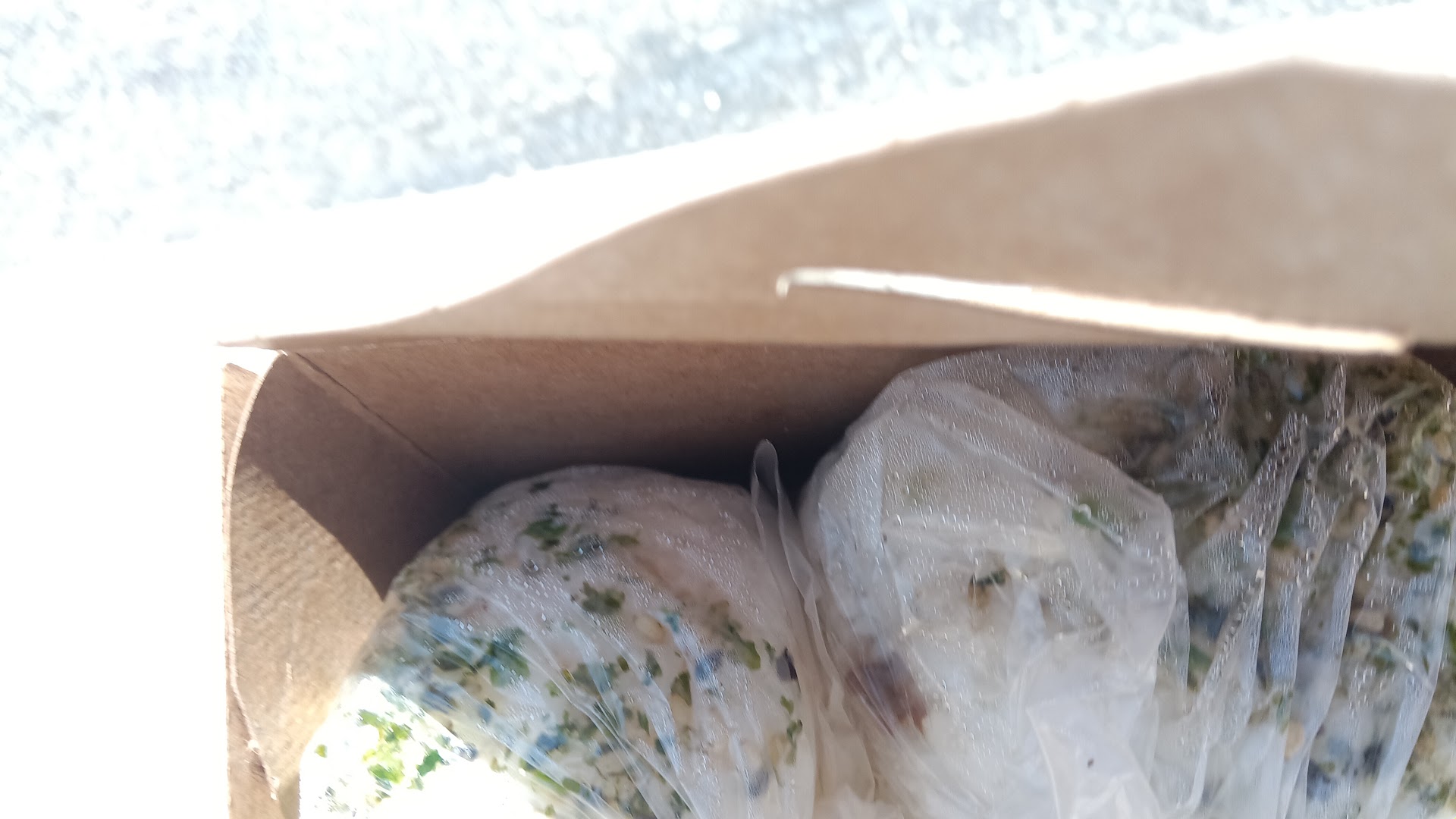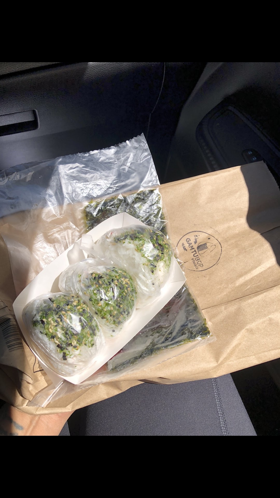 I mean, pretty straight-forward. Stuff wrapped in rice, then all that wrapped in dried seaweed. The way they give it to you is interesting. To fit all sorts of flavor palettes, they give you not just white rice, but a choice of brown rice. Then there's all sorts of different fillings to choose from. And Rather than simply just giving them to you all wrapped up in the dried seaweed, because the place is just designed for takeout, they know you're going to take this elsewhere, and not necessarily know when you're going to eat it. So to prevent the food from getting cold, or touching the rice with the moisture ruining the seaweed, they wrap the seaweed separately, and each individual portion you ordered is also wrapped. Then, it's just a matter of taking out the seaweed, and then dumping the rice with fillings on top, and folding the seaweed to wrap the rice yourself. Voila! Really straightforward, no fuss. I like it! The only thing is, I did ask for napkins in my order, but I should've asked for some before I...