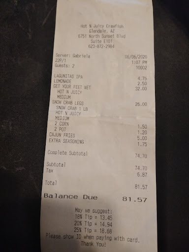 Read moreI had the worst experience in your establishment and no one tried to really help with what happened. My sister, daughter, niece and I show up Sunday evening after having a volleyball tournament at the Cardinals Stadium all day. We all ordered food, 1.5 lbs shrimp head-on, lobster, corn, potatoes, fried shrimp, and I ordered the soft shell crab basket. After waiting for an hour all the food comes out but mine. The server says it will be right up. She brings out food that I did not order with tomatoes on it which I am allergic to. She then takes it back to the kitchen. Comes back to say the kitchen is now closed I can give you this food at a discount. I was extremely unhappy and alarmed. I just said I was allergic and why would I pay for something I didn't order. I asked for the manager and a Team Leader walks over per his badge and says he just found out about it and there is nothing to be done. The other people at the table wanted to give their food back considering I had nothing to eat. I didn't feel like we should all go home hungry. I believe this was a lack of caring about your patrons. Something should have been offered to accommodate the mistake your staff made. Trying to give me something I'm allergic to and asking me to pay for it was a lapse in judgement on your staff. The server admitted that she put in the wrong order and yet and still nothing. I am extremely disappointed in the staff and the way you do business. I am also not understanding why all the white customers around us recieved their food in a timely manner yet ours took an hour and we didn't complain once until I was told I get nothing to eat. I asked for the GM information and was given Gabby's email written on a piece of scrap paper. I am confused as to why I wasn't worth giving an actual card to either. This was the worst display of customer service I have ever been given. I can't say if this locations food is good or not because I had none. I can say the lack of service skills will always hinder...