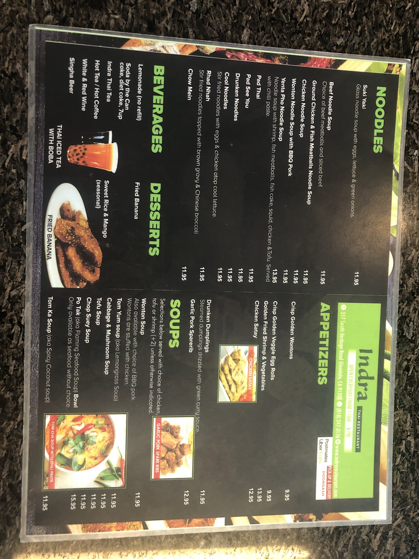 Read moreUnder the same caring family ownership since the 80's, Indra is a treasure. Try the wonderful Kra Pow, spicy and flavorful with garlic and basil. The Tom Yum soup is light and completely irresistible. They have great Thai iced tea and coffee. Indra is very popular with the local Thai community and is well known for its selection of Thai desserts which can often be found on the counter. The servers are very nice and have years of experience working there. The staff is very stable, which tells you something about how the restaurant is run. Prices are still very reasonable. I can't say enough good things about this unassuming strip mall Thai restaurant that is like a trip to Bangkok...