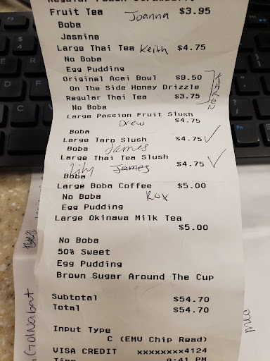 Read moreI want to rate this place higher because it would be really great for it to be better, but it just isn't. The black milk tea is good, and the boba is of a good quality, but everything else I've had has had some sort of mistake or off taste. Examples include- cheesecake having what I can only assume was paper baked into it, or something similar. Every bite had a not quite food texture. The chicken is alright. Nothing great, but nothing bad. But half of my drinks have not been sealed properly, and led to a leak or disaster in my car, which is frustrating. Ill go here again for convenience- it's the closest boba joint to where I live. But I probably won't be straying past their normal black tea. PS I don't recommended the strawberry matcha milk tea. The strawberries are absurdly sour and not in a good way. They ended up giving a really bad texture with the boba. All in all, ok. Not...