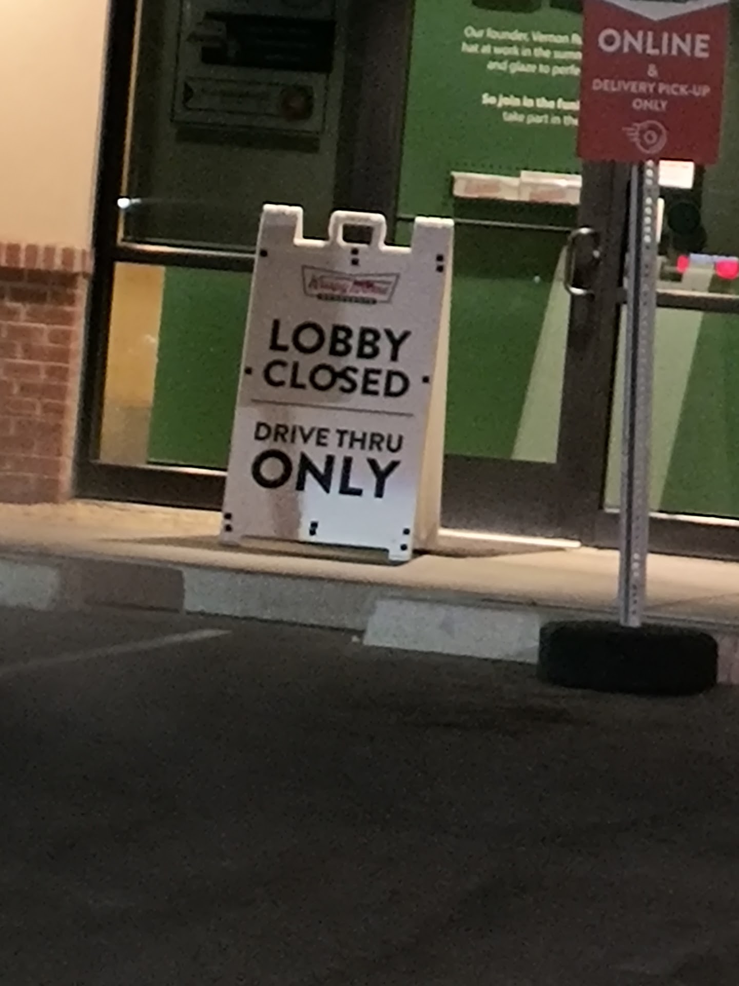 Read moreFinally have a picture worth attaching to a review! Both in my personal life as a consumer and when I drive for UberEATS, it drives me CRAZY when I go to a business, like fast food or Starbucks, where they have a drive through, and they don't tell you if their dining room is closed! Ever since the start of COVID-19, a lot of places closing earlier than I would expect, especially these kinds of places that prefer for whatever reason to close the dining room but leave the drive-thru open. I have multiple times lost my place in line and wasted time by parking, walking up to the front door, and being turned away by a locked door. I kept getting so mad and yelling out loud to myself, why don't you have a sign that says Dining Room Closed Please Use the Drive -thru?! I really don't think it is that hard to figure out but apparently it is. Apparently it takes some kind of genius who works for Krispy Kreme. I was so ecstatic when I saw this sign today! 9 Other than that, the service was a little slow, especially since we all had to go through the drive-thru, and I think it was shortly before 9 pm. . It kind of bugs me that places are closing SO early these days in general. But that's not really particularly pertinent here. I hope people start following your lead, Krispy Kreme, and start following logic, putting instructive signs out for customers to make processes more quick, efficient, and generally more enjoyable! (And...