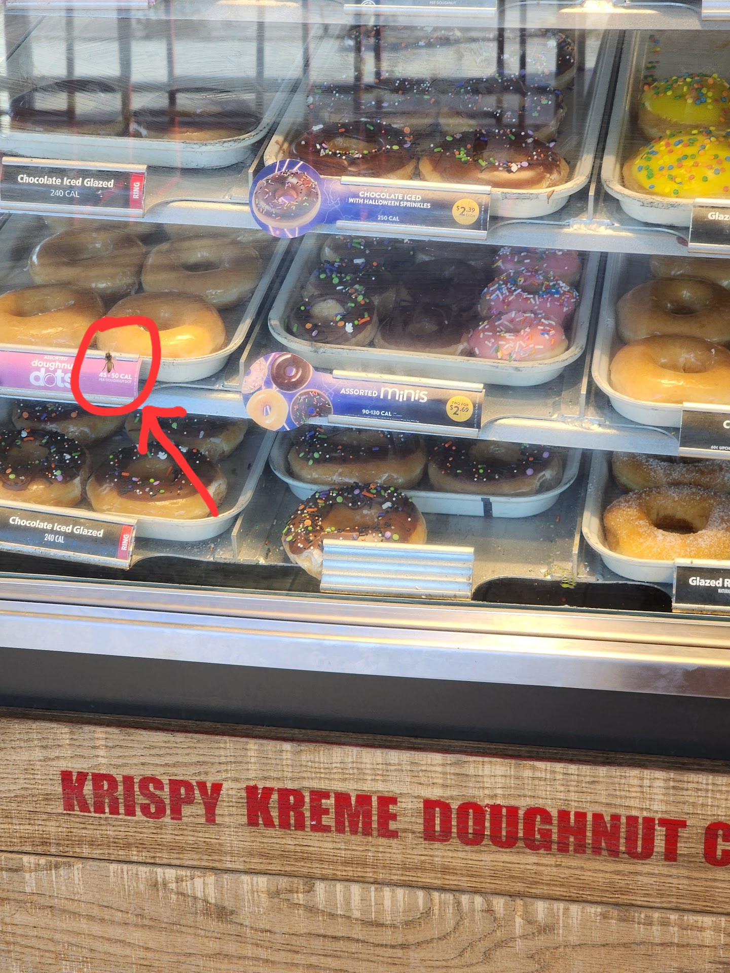 Read moreI haven't had Krispy Kreme in several years but I decided to place an online order today for a doughnut and a latte. On the website it said to pick up the order inside when normally I'd go through the drive thru. I'm glad I did because what I saw inside was something that made me never want to eat there again! As I'm standing in line, I see something flying out of the corner of my eye. I look over to see not one, but TWO WASPS INSIDE the display case WITH THE DOUGHNUTS THAT THEY SERVE PEOPLE. I'd almost understand stubborn small pests like fruit flies or something, or even maybe one rogue wasp, but multiple? It begs so many questions. I can only assume they have a wasp nest that they've decided to ignore. It's clearly a sanitary issue, but moreso a safety issue. I know I was not the only customer to notice them either.