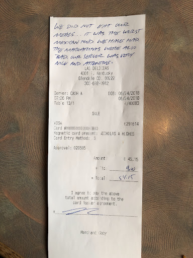 Been coming here for 20+ years. Service is always mediocre at best, but there are times when I am hangry and craving quickly made Mexican food, so off to LD's I go. Last night's service was the worst yet. Our server was not a good listener at all. Started with drink orders. I said I would stick with water. My son ordered a Dr. Pepper. The server then repeated that we wanted two Dr. P's. No. Just one. We ordered our food once the soda arrived. We wanted two roasted jalapeños as well. I also stated I would be placing a to-go order later. He said ok. The attentive busboy refilled my water and gave us more salsa. Our food arrived, no roasted jalapeños, though. We waited to see if he would bring them separately. He never came back except to bring the bill. Never asked if we wanted something else and, obviously, forgot I wanted to place a to-go order. We had to wait 5+ minutes for him to come back at which time he asked if I can pay him. I told him I needed to place the to-go order of 3 bean tostadas. He whipped the check off the table brought it back and charged me for 3 beef tacos. I had to flag him down to let him know the order was incorrect. Again he took the bill, came back and said that I would be getting the bean tostdas and not the tacos even though the bill still had the beef tacos listed on it. He said they were the same price. He then asked me to pay him. He left to to process my card and stood at the table while I added tip (much less than the 20% I typically give) and signed his copy. He grabbed it, said thank you and walked away. My son had to ask the busboy for a box to take home his leftovers. Once we received the to-go order, we immediately left. This server was the nail in the coffin after coming here since 1998 (I can still recall that even the Riviera had consistent better service). We will continue to support our 'new' favorite Mexican...