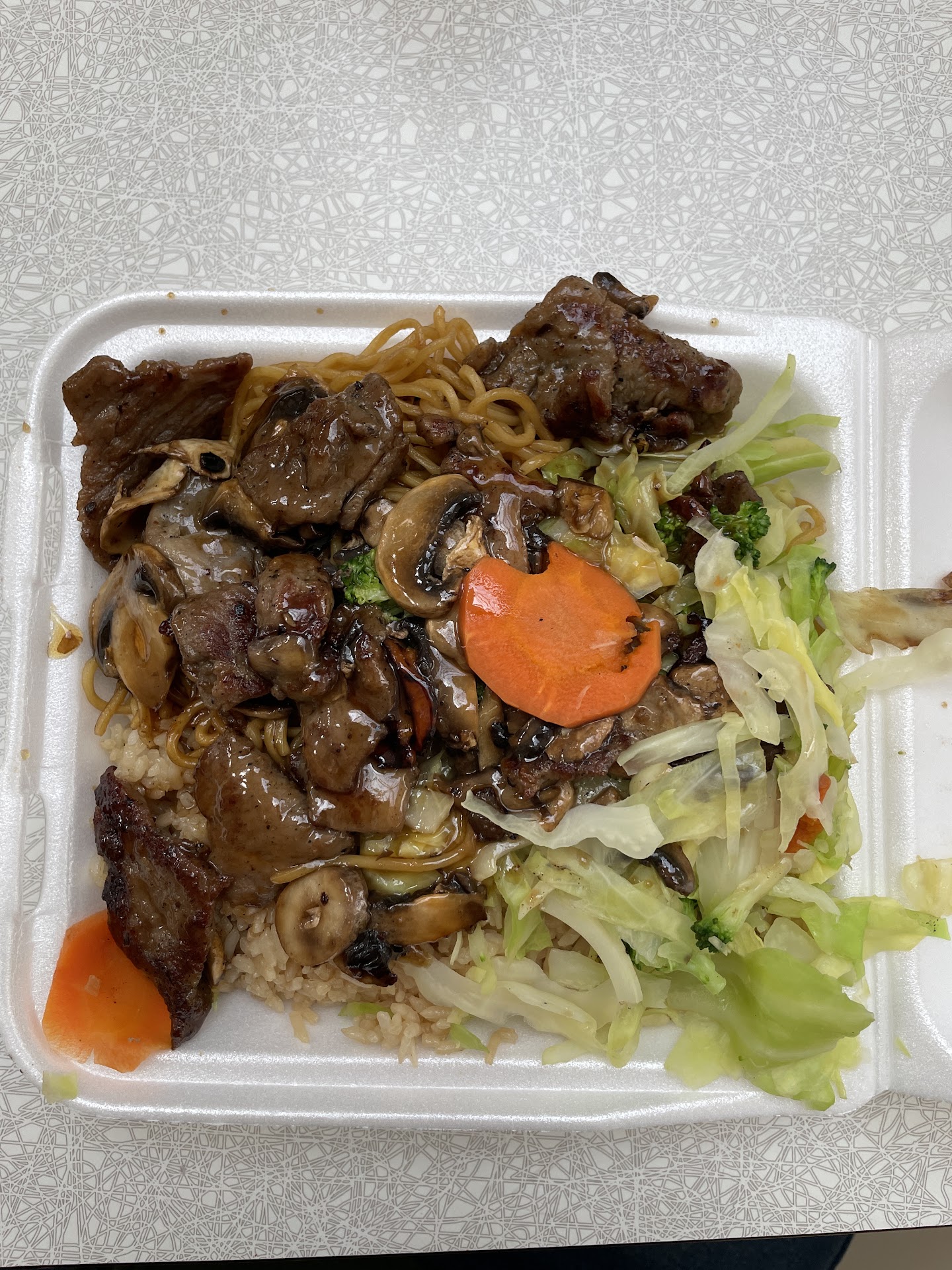 Ā Ā Ā Read moreSeaweed salad: yay! Bright green and crunchy strands coated in toasted sesame oil is a delicious side, but hard to get it esp. at a reasonable price, so at $2.09 I happily added it to my Beef and Shrimp Bento Box and I was not disappointed. The outdoor seating area outside the mall's food court overlooking palm trees and distant mts. made me feel I was at some resort, except for the plastic throwaway plastic box and the lid they make you take even if you're eating the meal onsite (we really need to do away with all excessive unnecessary waste!) The dumplings were a little dry but the filling had a nice gingery flavor and the CA roll was fine, as was the main meal. Nothing extraordinary but for $9.99 it was a well balanced meal with veggies that didn't slither out of a can, and all was freshly made and some nice spicy notes. Remember to tip the very competent and pleasant chefs--they should put the tip jar near them rather than at the register--and remember to watch them prep your food on the griddle, ala low...