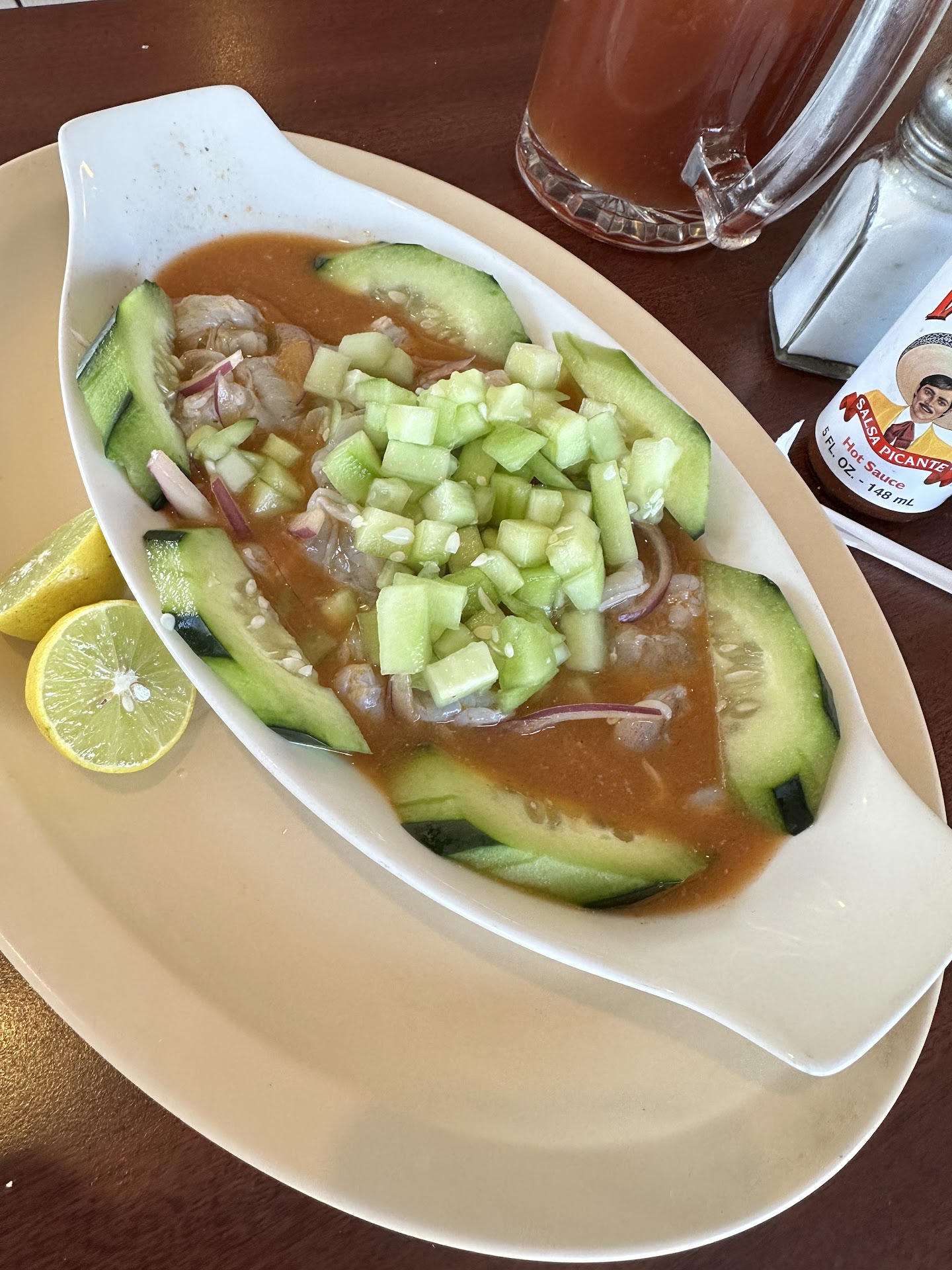 I ordered ice water and a tostada mixta, which the menu said cost 20 dollars. I know paying 20 for one food item is alot, but if you know, you know. Well, to my dismay, it was quite flavorless. I bit into a shrimp and my teeth felt like it was chewing sand. The shrimp was not deveined.
